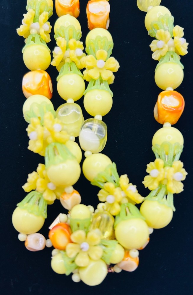 This vintage double strand fruit salad necklace from Hongkong features yellow plastic beads in a beaded style. Signed from the 1960s, this 20-inch necklace is a unique and original piece of fashion jewelry for women. The colorful and eye-catching design makes it a standout accessory for any outfit, perfect for those who appreciate vintage and antique jewelry pieces with a touch of nostalgia.