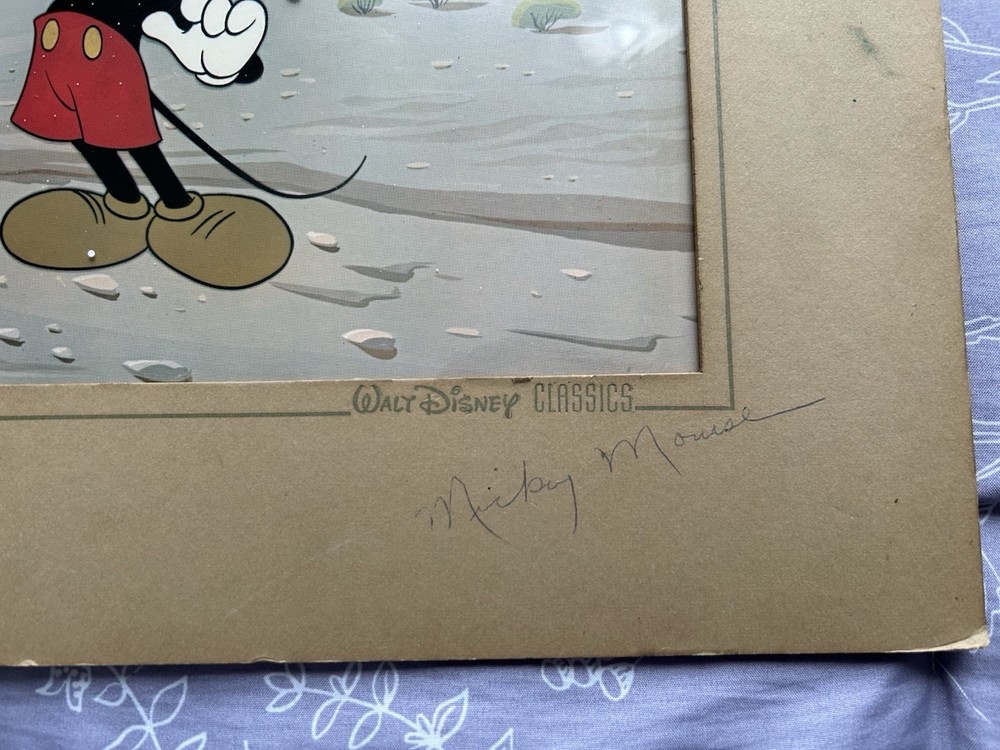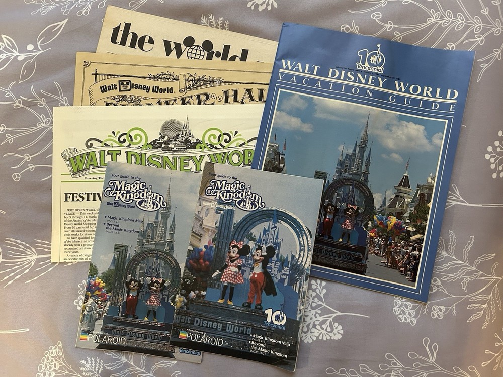 Vintage Walt Disney Classics matted print of Mickey Mouse—signed by Mickey Mouse as well. The back reads, “This art work has been authentically reproduced from selected originals used in a Walt Disney production.” The matte has yellowed and has a few marks, and the plastic protection sheet has some white spots on it. Slight signs of wear on both front and back—please see photos. Despite its wear, it would be super neat to see it hung up in a frame! Also, 10th Anniversary Vacation Guide, park newspapers, and Magic Kingdom booklets!