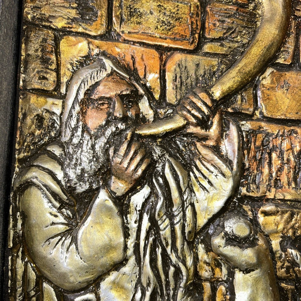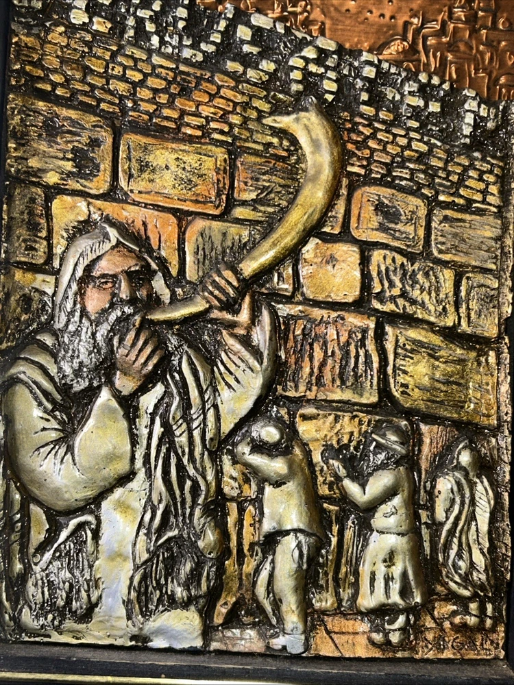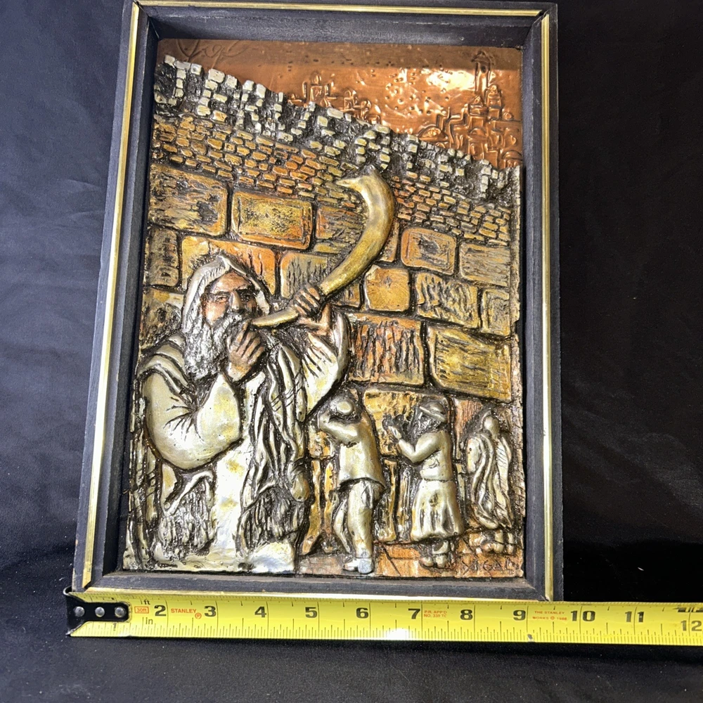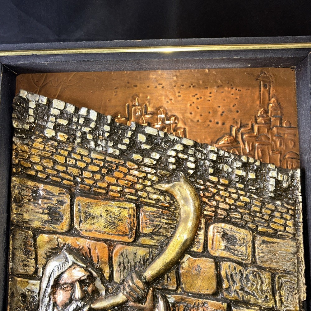 Resin on copper repousse. Signed bottom right corner. Subject depicts a man blowing a horn near the western wall where Jews pray for forgiveness for their sins on Yom Kippur. Framed in wooden frame with gilt accent. Frame measures approx. 9.75 W x 13.5 H in. Window measures approx. 8.5 W x 12.75 H in. Not viewed outside of frame. Separations in gilt accents at frame corners. Wear consistent with age. Relief sculptures, high relief sculptures, framed sculptures, copper repousse, repousse, framed repousse, Jewish art, Yom Kippur, signed art, signed artwork, artist signature, home decor, interior decor, Yigal Yom Kippur Western Wall High Relief. 9 artwall