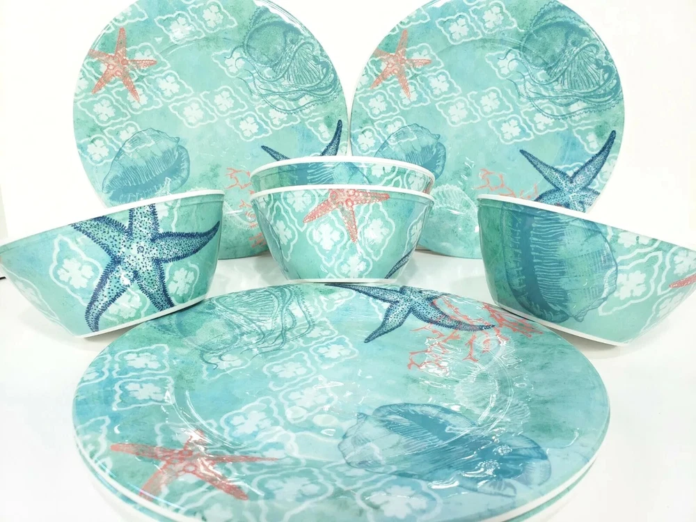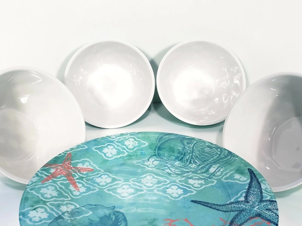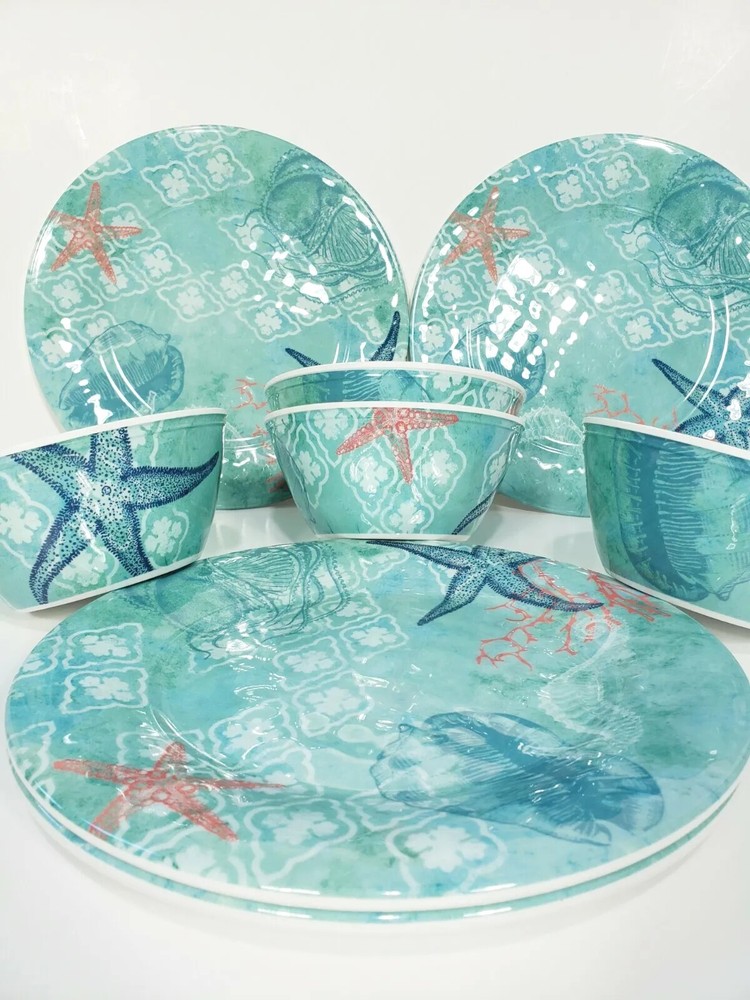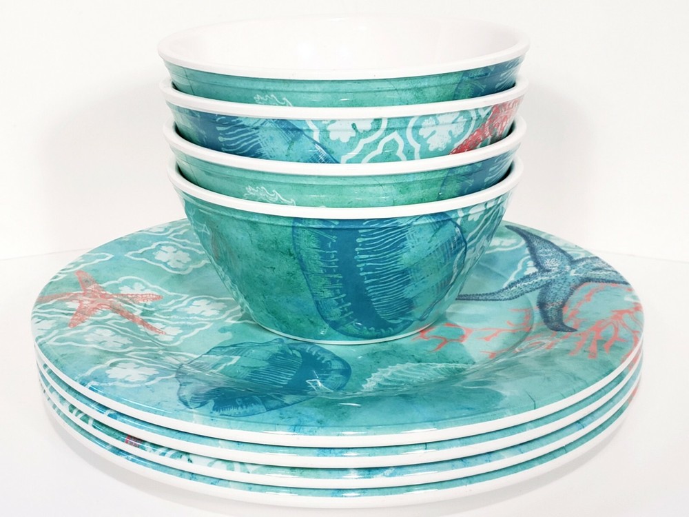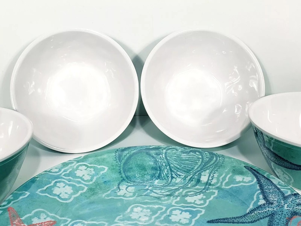 Sigred Olsen Melamine Dinner Plates & Bowls 8pc Sea Life Ocean Marine. Four soup cereal bowls 6" across 3 3/4" deep Four dinner plates 10 1/2" across Heavy duty construction All pieces are in excellent condition Very lightly used no scratches in bowls Only a couple of scuff marks on dinner plates no deep scratches great for RV , camping Picnicking