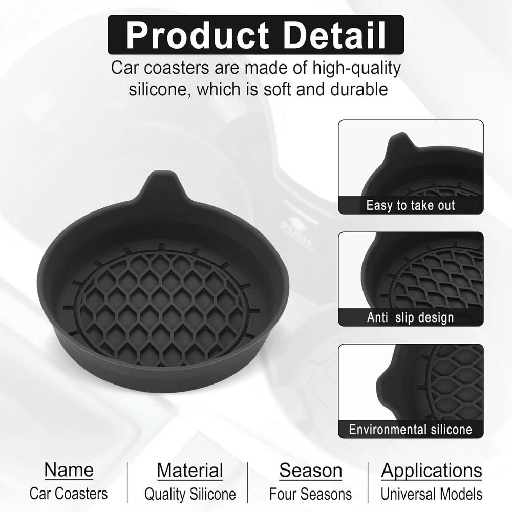 High Quality Material: The coaster is made of environmentally friendly silicone, safe, non-toxic and odorless. Soft with toughness, easily embedded in the cup holder. Very durable, wear-resistant, long service life. High temperature resistance, can withstand 100 ℃ high temperature water cups. Wide Compatibility: The coaster has a diameter of 3.15 inches and a height of 1.18 inches, which is widely used in most vehicles, such as SUV, sedan, MPV, etc., as long as the size fits your car cup holder. Protection Function: Our car cup holder coaster has a carry handle design and a stand-up ring edge on its edge to effectively prevent food crumbs, drinks and water from leaking out and preventing the car cup holder from getting dirty.Meanwhile,Thickened design effectively prevents the cup holder from being scratched by the cup when driving on bumpy roads and eliminates the annoying thumping sound, making your journey more enjoyable. Easy to Use and Clean: With embedded installation, you just need to put it flat on the car cupholder. It is also very quick to remove, there is a small bump on the coaster, pinch it and you can easily remove the coaster. It is very easy to clean, rinse with water or wipe with a wet towel (be careful not to clean with sharp tools). 100% Satisfaction: Our products have quality assurance, if you have questions or are not satisfied after receiving the product, don't worry, please contact us as soon as possible, we provide after-sales service. Product Description High quality coaster Waterproof and dust-proof, keep the cup slot clean and tidy The coaster can effectively insulate heat, and the coffee cup can prevent scalding the table It is made of high-quality silicone, which is soft, flexible, durable and not easy to deform Groove pattern design, beautiful appearance, various colors and styles, can add color to your car Rich usage scenarios In the car Suitable for most models, can reduce friction cup sliding At home Widely used in home kitchen and bedroom At office Don't worry about spilling it on the desk and damaging office supplies