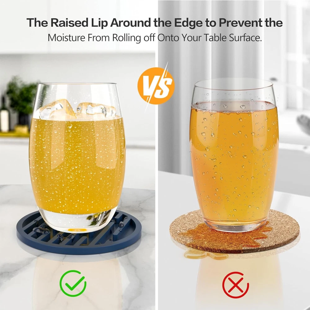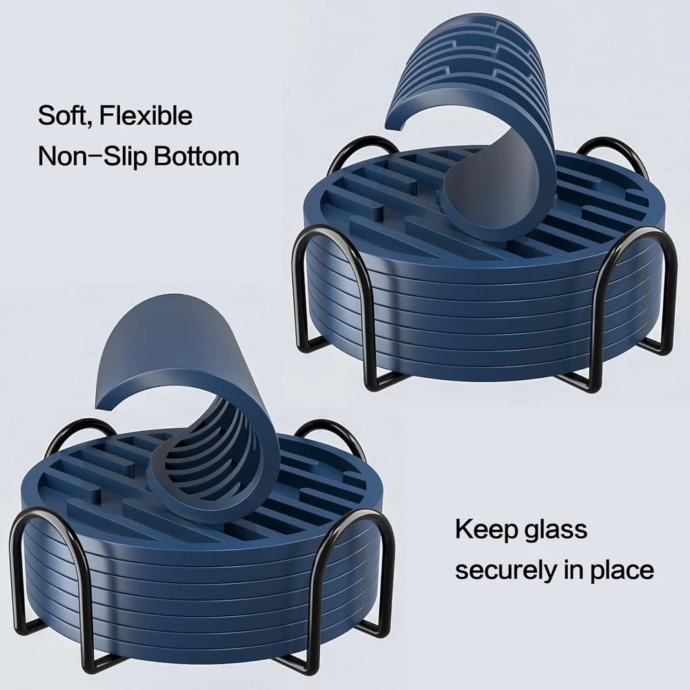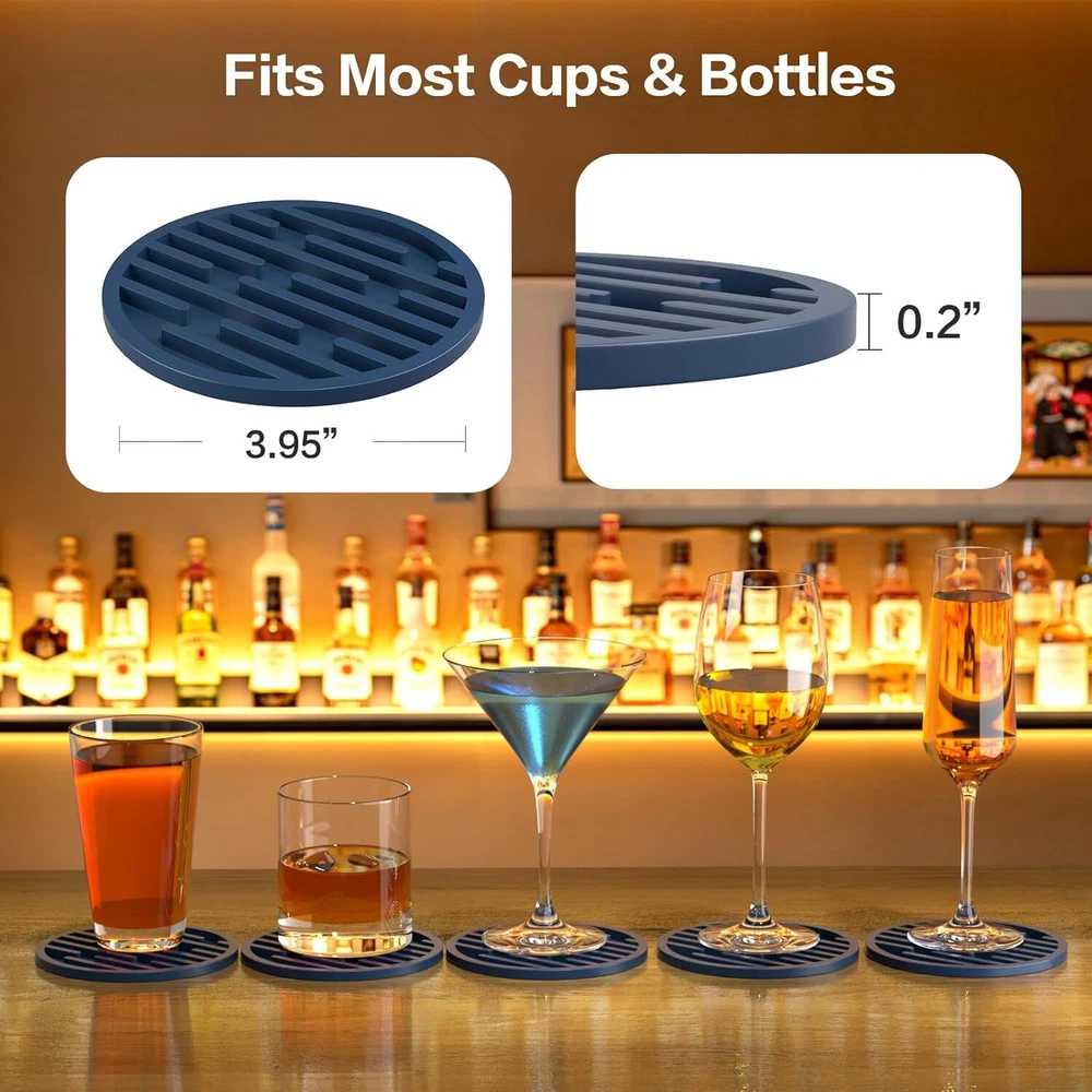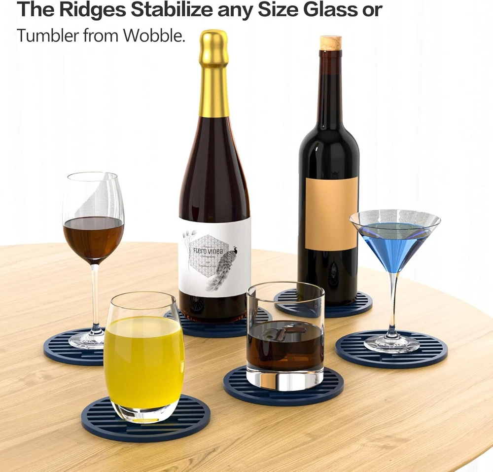 Silicone Coasters for Drinks, AUPTIM Drink Set of 6, Cup Blue Product Details Color: Blue Material: Silicone Brand: AUPTIM Shape: Round Product Care Instructions: Machine Wash Is Dishwasher Safe: Yes Product Dimensions: 4"L x 4"W Manufacturer: FLYINGCOW Number of Items: 6 Item Weight: 7 ounces Country of Origin: China Item model number: Ridges 【Keep Your Glasses Out of the Mess】: The bottom of the desk coaster is shiny smooth so if you place it on a granite counter top or glass top table, the costers sticks in place and does not slide around. Placing your coffee cup on the counter or table is now met with a gentle thunk instead of a harsh clank 【Smart Design】: The ridges on the inside are firm, so no worries about stability. The multiple-line shape works much better, The bottom of glasses of all sizes land on the lines, so your drinkware don't wobble. And the coaster are sturdy enough to pick up and empty out in the sink without spilling 【Solve the Condensation Problem】: The ridges ALSO prevent the condensation from creating a seal around the bottom of your cups/glasses, so they don’t suction together, and no spills of the pool of condensation when you pick the glass up. The rubber coasters don’t break if they fall off the table, and do not mare the surface they fall on 【Silicone made, durable, classy coasters】: Multiple uses, more than just coasters. Anywhere you don't want something to contact something else. The modern coasters are great for protecting your counters & tables from scratching up, Also can be used to help twist off caps or open jars. A quick rinse and like new. Perfect 【MULTIPLE USAGE】: The Coasters are more than just ordinary coasters, it can be used for cold or hot drinks in any occasion a variety of cups,silicone home decor coaster can easily handle.They can also be used as tripods or can openersm and hot mitts,small trivet,kitchen table pad,small pot holder