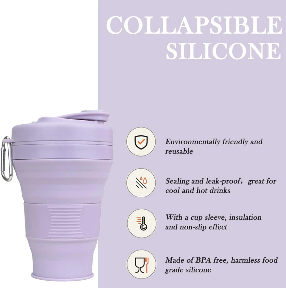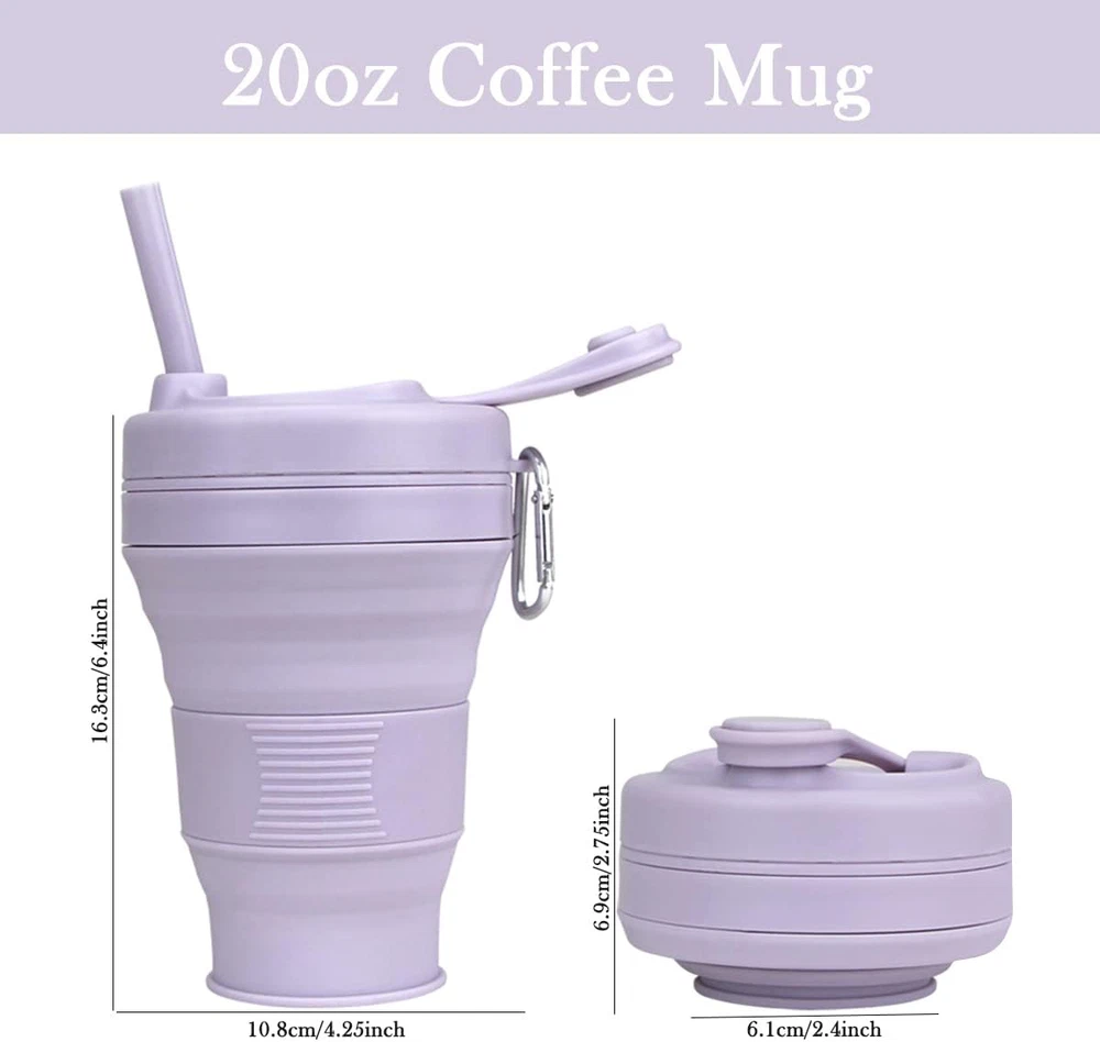 BPA-Free Material- This collapsible drinking cups is made of food-grade silicone, safe and odorless PP lid and cup sleeve, both environmentally friendly and reusable. Portable & Practical- Folded height of cups only 2.75 inches, with hiking buckle design, whether for indoor use- home and office, or outdoor activities- such as camping, cycling, hiking, picnic, climbing and etc, easy to carry and storage. Versatile Coffee Cup- 600ml large capacity, can be filled with cold and hot drinks. The lid is designed with a drinking spout and is come with a reusable straw. Threaded cup sleeve provides non-slip and anti-scald function. Creative Design- In gray, pink, khaki, purple, orange and green available. The surface is smooth and brightly colored.It is also very suitable as a housewarming gift for your friends. Home Essentials- -50℃ to 200℃, high temperature resistant and easy to clean, dishwasher or hand washable. Natural air dry, no odor. Soace saving and great chice for outdoor.