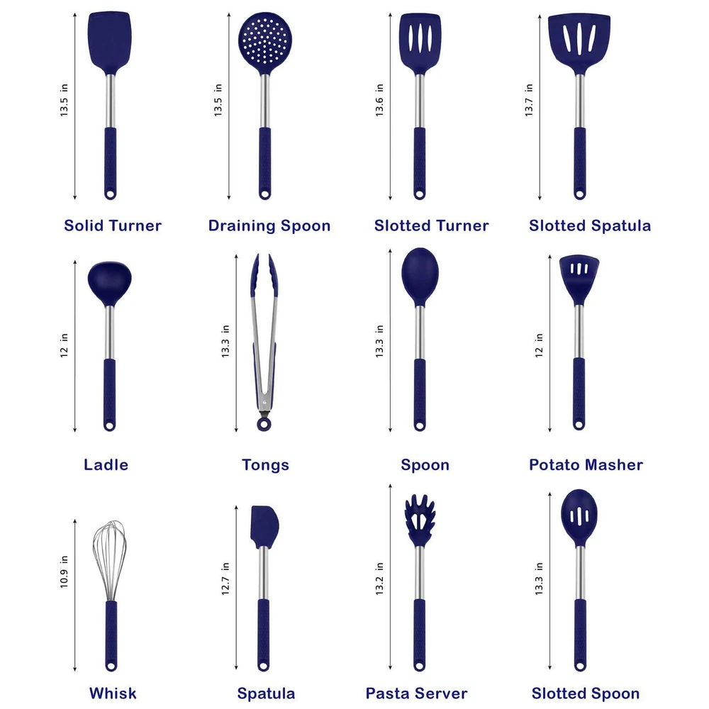 【All You Need For Cooking.】 Set includes slotted spatula, slotted spoon, flexible spatula, slotted turner, solid turner, pasta server, solid spoon, kitchen tongs, draining spoon, whisk, deep soup ladle, spatulas and potato press. 【Heat Resistance and Soft Nonstick Silicone, Protect Your Cookware.】 Heat-resistance up to 482°F (250°C). Bpa free & food grade silicone does not react with food or beverages, or produce any hazardous fumes. 【Stainless Steel Handles with Silicon, Durable and Anti-Skid.】 The stainless steel handle is durable and solid. The silicone coated is non-skid and comfortable to the touch, completely prevents the heat transfer during the cooking process. 【Easy to Clean Up and Storage.】 Dishwasher Safe. The utility hanging hole designed on the handle, Come with 12 hooks, make they easy to hang for store. They also can be stored tidy in the Rotated Utensil Holder. 【Elegant Image, Stylish Color, Ergonomic Design and Functional.】 This kitchen tool set is a perfect gift for many occasions such as Christmas, Thanksgiving, wedding, birthday, and housewarming.