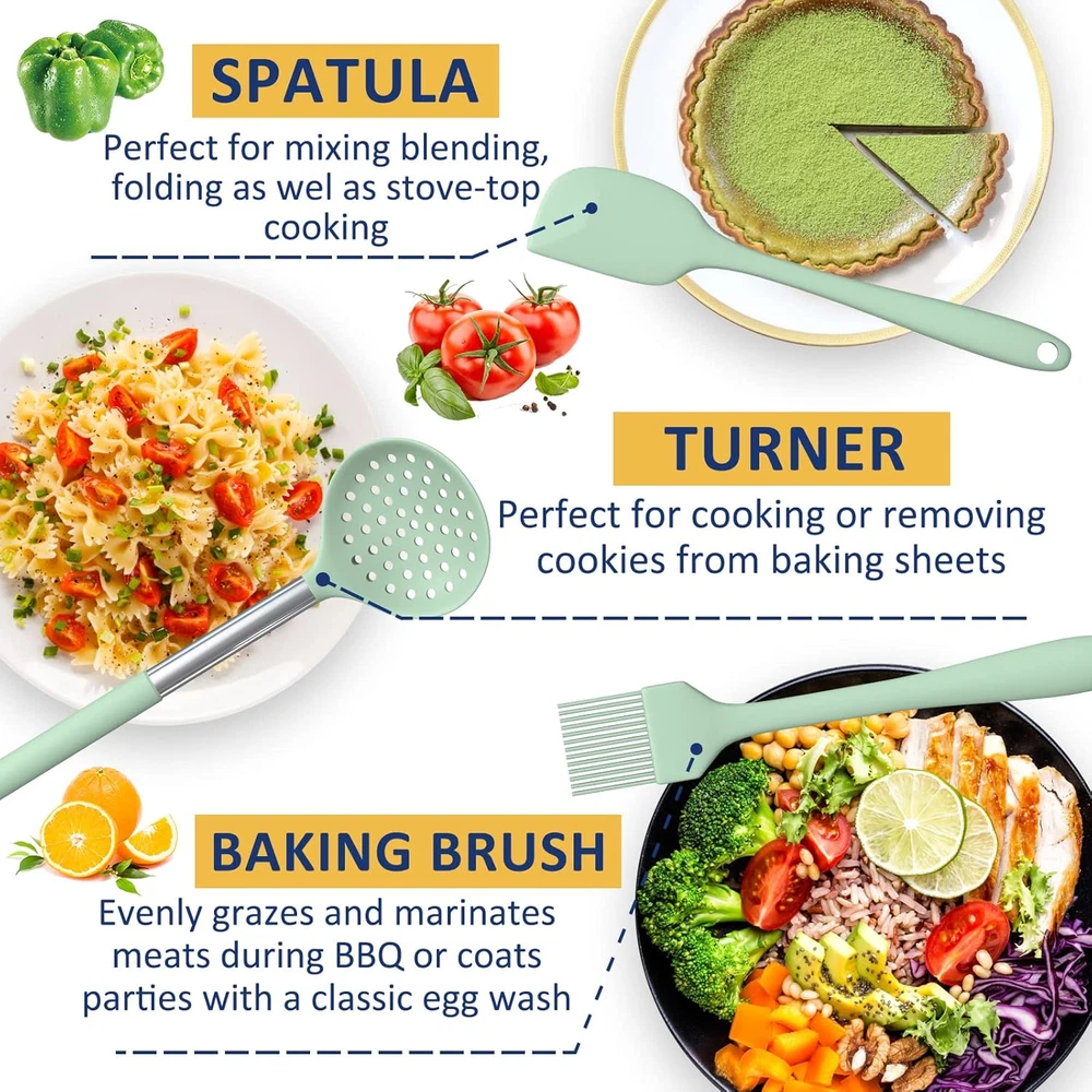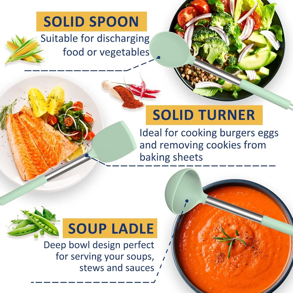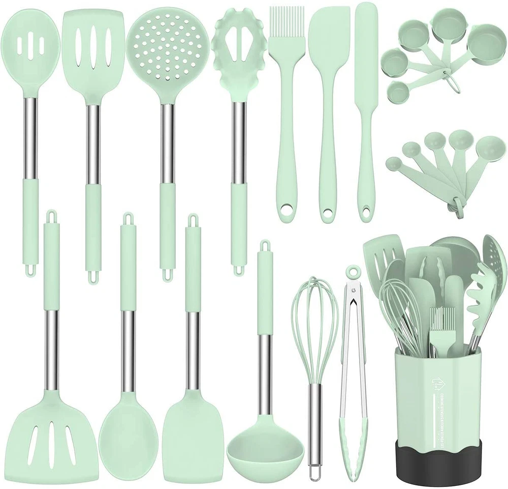 24 Pcs Professional Silicone Kitchen Utensils Set: Fungun Kitchen Utensils Set includes 5pcs Measuring Spoons and 5pcs Measuring Cups, Slotted Spatula ,Slotted Spoon,Flexible Spatula,Slotted Turner, Solid Turner, Pasta Server,Solid Spoon, Kitchen Tongs, Draining Spoon, Whisk ,Deep Soup Ladle,Spatulas and Brush. 24 Pcs different Utensils making your cooking much intersting and easier Stainless Steel Handle & Food Grade Silicone: Made of food-grade silicone, safe for any type of food. firm silicone heads, sturdy stainless control and fantastic grip, premium quality heat-resilient silicone heads, designed to protect the non-stick surface of your precious pans. This will keep your cookware safe from scratching, BPA free. No rust. No breaking or bending. No melting. not produce any hazardous fumes.Anti scalding silicone handle sleeve protect your hand from burning Heat-Resistant & Avoid the Melt: The Silicone Cooking Utensils can withstand high temperatures up to 446°F/230°C. All-around silicone added to the softness, no longer worry food will stick your cookware. Silicone head protect your pans, keep the cookware surface not scratched or dented. Extend the life of all your kitchen pans Easy To Clean: With stainless steel core never warp. One-piece molding without any gaps to capture food. Make cleaning easier. comparing to the cheap plastic kitchenware, it doesn't retain odors or colors when you use it for stirring deep-colored food.It’s a great gift for anyone who loves to cook, a nice gift set for your friend’s/family’s house warming party/wedding party A Great Companion In The Kitchen: Prepare for many sessions of exciting cooking! Grill, whip cream, stir sauces, mix ingredients, flip eggs, burgers or pancakes, pan fry or stir fry as much as you wish. No excuses! an extra utensil holder that allow you to store all your kitchen gadget utensil set conveniently, Solid holder base ensures utensils fit properly, circular opening at the bottom ensures that the silicone cooking utensils in the holder is always kept in a dry environment Product Description ELEVATE YOUR COOKING EXPERIENCE AND ENJOY THE DELICIOUS FOOD 100% PREMIUM BPA FREE NON-STICK FOOD GRADE SILICONE: BPA free, food-grade,silicone safe for any type of food.does not react with food or beverages, or produce any hazardous fumes, You and your family can use them with peace of mind FOOD GRADE SILICONE Made of food-grade silicone, BPA-free, can use in any type of food HEAT RESISTANT The Silicone Cooking Utensils can withstand high temperatures up to 446°F/230°C SOFT SILICONE Silicone head protect your pans, keep the cookware surface not scratched or dented DURABLE Sturdy than other usual kitchen utensils, ensures daily use for a long time without being worn down