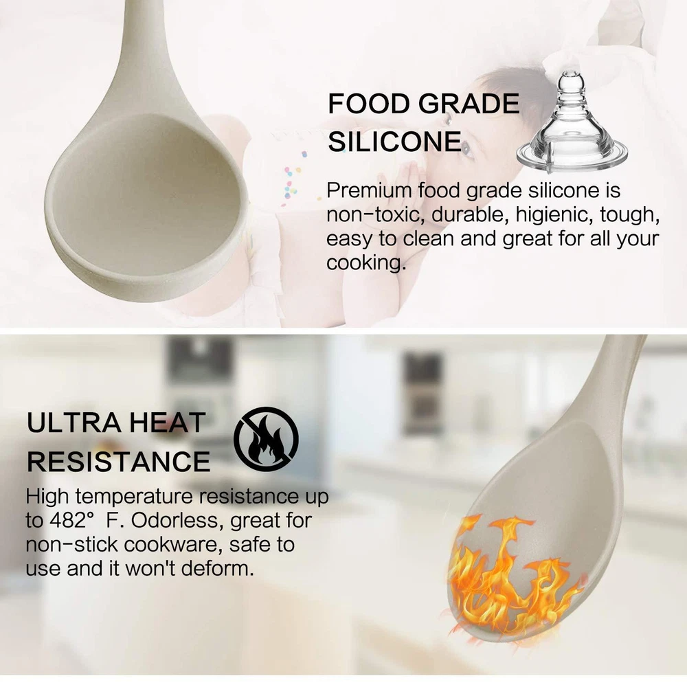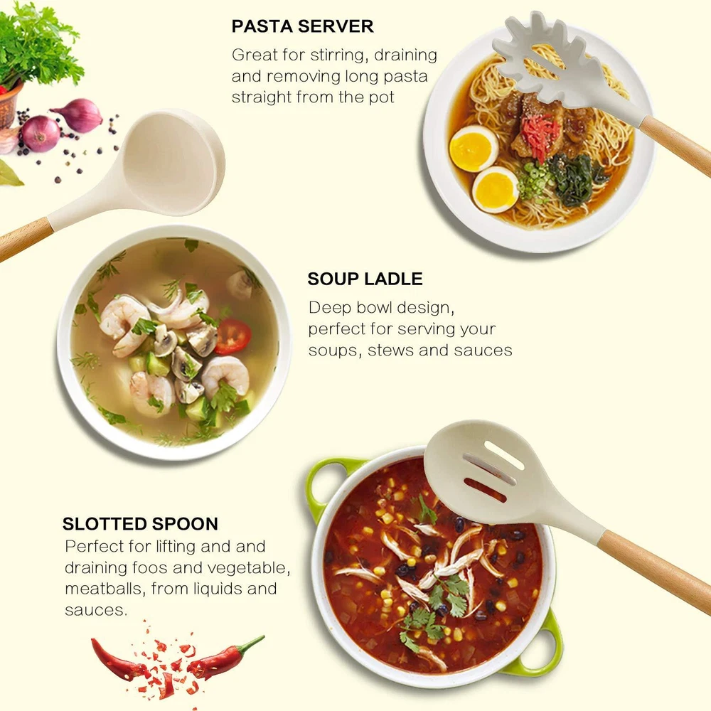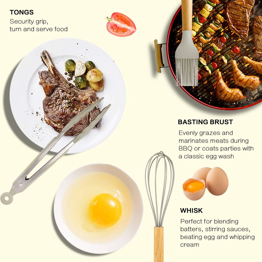 Silicone Cooking Utensils Set Our Kitchen Utensils Set is designed to make your cooking easier and faster. Each one of our utensils is sturdy, durable, premium food grade silicone heads that are position firmly in their acacia wooden handles. Our FDA approved, BPA free, non-stick kitchen utensils set are the perfect set for any kitchen. Features: Premium Food Grade Silicone Kitchen Utensils This premium silicone has great flexibility, the soft surfaces prevent scratching, scuffing or damaging your cookwares. The Silicone Heads are LIGHT GREY. Elegant Wooden Handle The wooden handles are sturdy and very durable. Ultimate Kitchen Essentials Utensils Set Our utensil set makes a perfect kitchen gadget gift for any occasions, including birthdays, Christmas, weddings and house warming parties. Stylish Utensils Set Unlike those bright colorful sets, our cooking utensils set will actually bring elegant into your kitchen. With our secure and stylish packaging, it will be a best cooking utensils for anyone. NOTES: Acacia wood should be hand-washed but NOT soaked in water and not exposed to extreme hot or cold temperatures. Please do NOT place them into dishwasher. Do not use steel wool or grinding tools to clean them. Before or after use, please wash it with warm water in time and keep it dry. Package Includes: 16 Pieces Cooking Utensils 1 x Deep Soup Ladle 1 x Solid Serving Spoon 1 x Flexible Spatula 1 x Slotted Turner 1 x Whisk 1 x Turner 1 x Basting Brush 1 x Slotted Spoon / Strainer 1 x Round Spatula 1 x Pasta Server 1 x Tongs 5 x Measuring Spoons 【21 Pcs Organic Silicone Cooking Utensils Set】The silicone kitchen utensil set includes 21 pcs tools that will satisfy all your cooking and baking needs. Our silicone utensil set with holder includes: Slotted Spoon, Soup Ladle, Solid Turner, Slotted Turner, Kitchen Tongs, Egg Whisk, Basting Brush, Pasta Server, Round Spatula, Solid Spoon, Solid Spatula, Spoon Spatula, Spreader Spatula, Also comes with the gift of 5pcs small Measuring Spoons of different sizes and 2pcs silicone oven mitt. 【Safe, Bpa Free, Food Grade Silicone】Our spatula set are made from the highest quality food grade silicone, BPA free, silicone is safe to use for any type of food, does not react with food or beverages, or produce any hazardous fumes. you don’t worry about the health of your families. And it will probably last longer than the other plastic kitchen utensils. This Kitchen Tools is the best gift choice for mom. 【Heat-Resistant, Non-Stick & Non-Toxic】The silicone cooking utensils can withstand temperatures up to 482°F/250°C, Even if they are used in the high temperature environment of frying, you don't have to worry that it will melt when you accidentally leave it in the pot for a while. And it doesn't retain odors or colors when you use it for stirring deep-colored food. Kitchen utensils are also non-stick and non-toxic. This is completely different from cheap plastic kitchenware. 【Anti-Scalding and Ergonomic Design Wooden Handle】 This utensil handle is made of solid wood, smooth and comfortable to the touch, it has great heat insulation, completely prevents the heat transfer during the cooking process to protect your hands. It is ergonomically designed for comfortable grip. A utility hanging hole on each wooden handle for convenient storage organization using hooks or a wall mount. 【Worry-Free After Sales Service】Our kitchen utensil set with holder are under strict quality standards so you can use it with confidence. If you have any questions with this cooking utensil set, please feel free to contact us and we will give you a satisfactory answer.