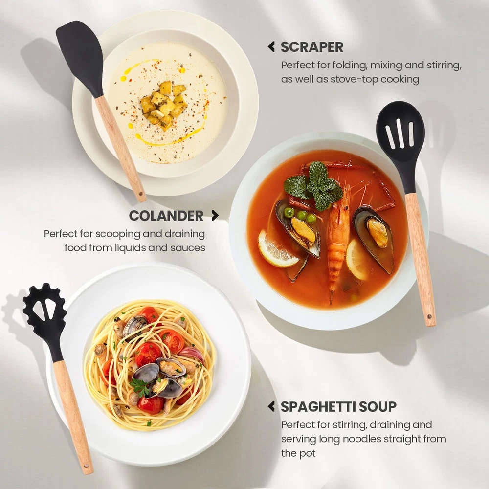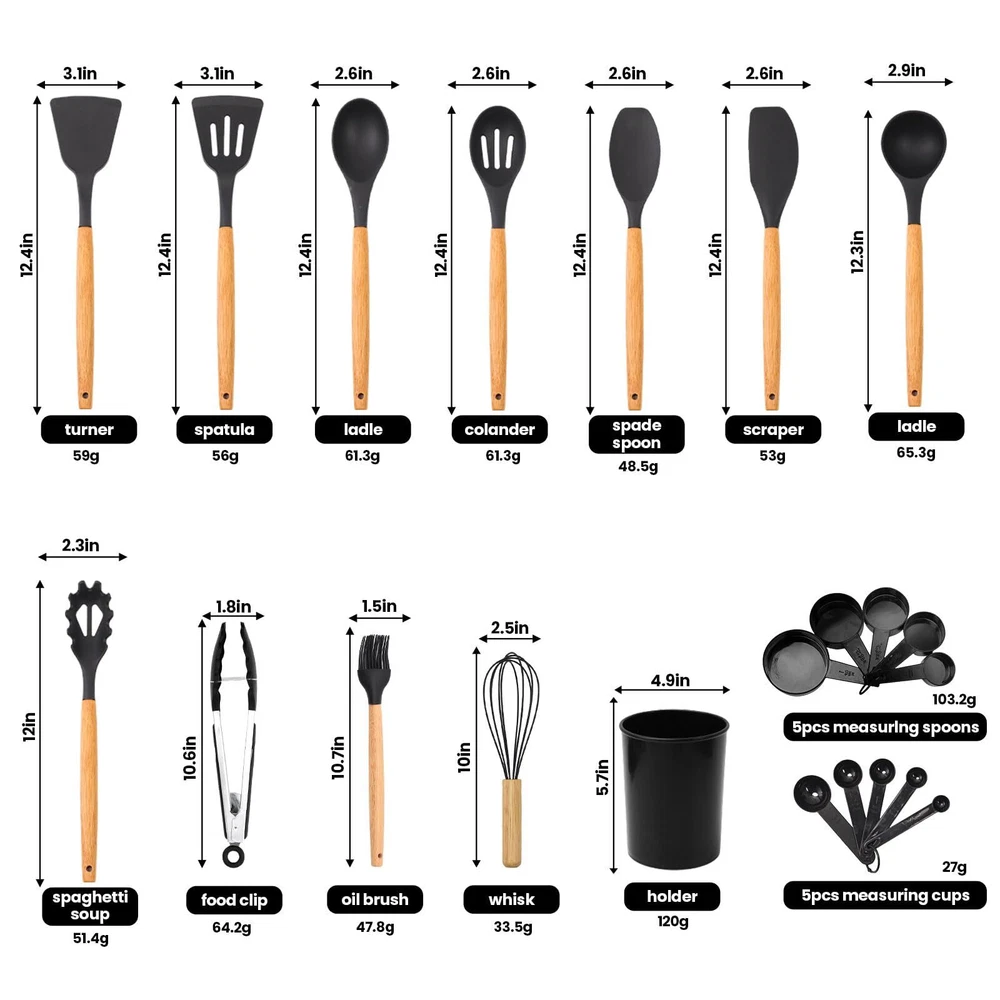22 SILICONE COOKING UTENSILS SET: Utensil Set includes everything you need to cook that perfect dish, includes Spatula, colander, strainer, scraper, spatula, strainer, oil brush, egg beater, food tongs, pasta grabber, soup spoon, tube, measuring cup (set of 5), measuring spoon (set of 5). HIGH QUALITY MATERIALS: Made of food-grade silicone+Wooden handle, BPA-free, can use in any type of food. And it will probably last longer than the other plastic kitchen utensils. Note: It must be soaked for half an hour when it is used for the first time, and then exposed to the air for about 3 hours, the original smell of silica gel will disappear.This silicone cooking utensils does not react with food or beverages, you don’t have to worry about the health of your families will not retain odors or colors. HIGH TEMPERATURE RESISTANCE: The silicone cooking utensils can withstand temperatures up to 446°F/230°C, even if they are used in a high-temperature frying environment, they will not melt or produce smoke. The wooden handle feels comfortable prevents heat transfer, so you don’t have to worry about scalding the chef’s hands. Silicone head protect your pans, keep the cookware surface not scratched or dented. Extend the life of all your kitchen pans. EASY TO CLEAN AND STORE: Our silicone utensils set for cooking Due to the wooden handles, these kitchen tools are not dishwasher-friendly, but any remaining dirt can be rinsed right out in seconds, and the small holes on the wooden handles allow you to hang them up for storage without taking up too much space. STRONG AND DURABLE: Our wooden kitchen utensils are stronger, ensuring no wear and tear from daily use. Designed not to bend, break or rust, and full of flexibility. Molded in one piece, without any gaps to catch food. Anti-scratch silicone head pairs perfectly with your expensive non-stick pans, pots and bakeware.