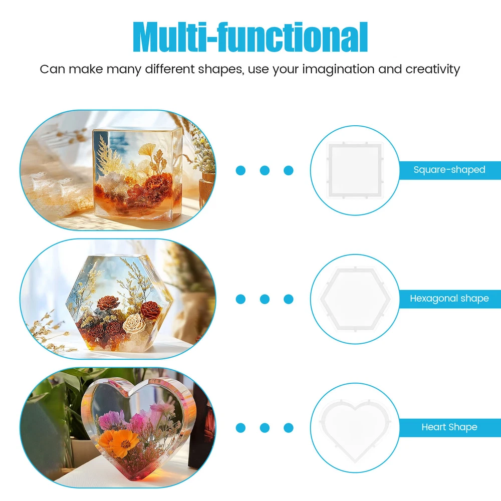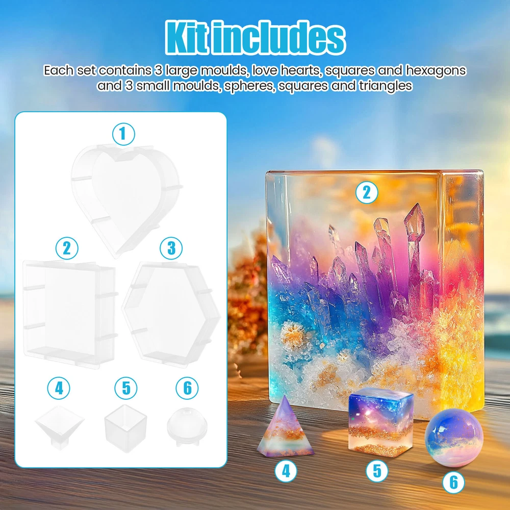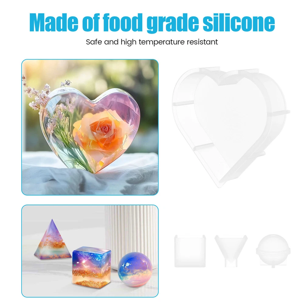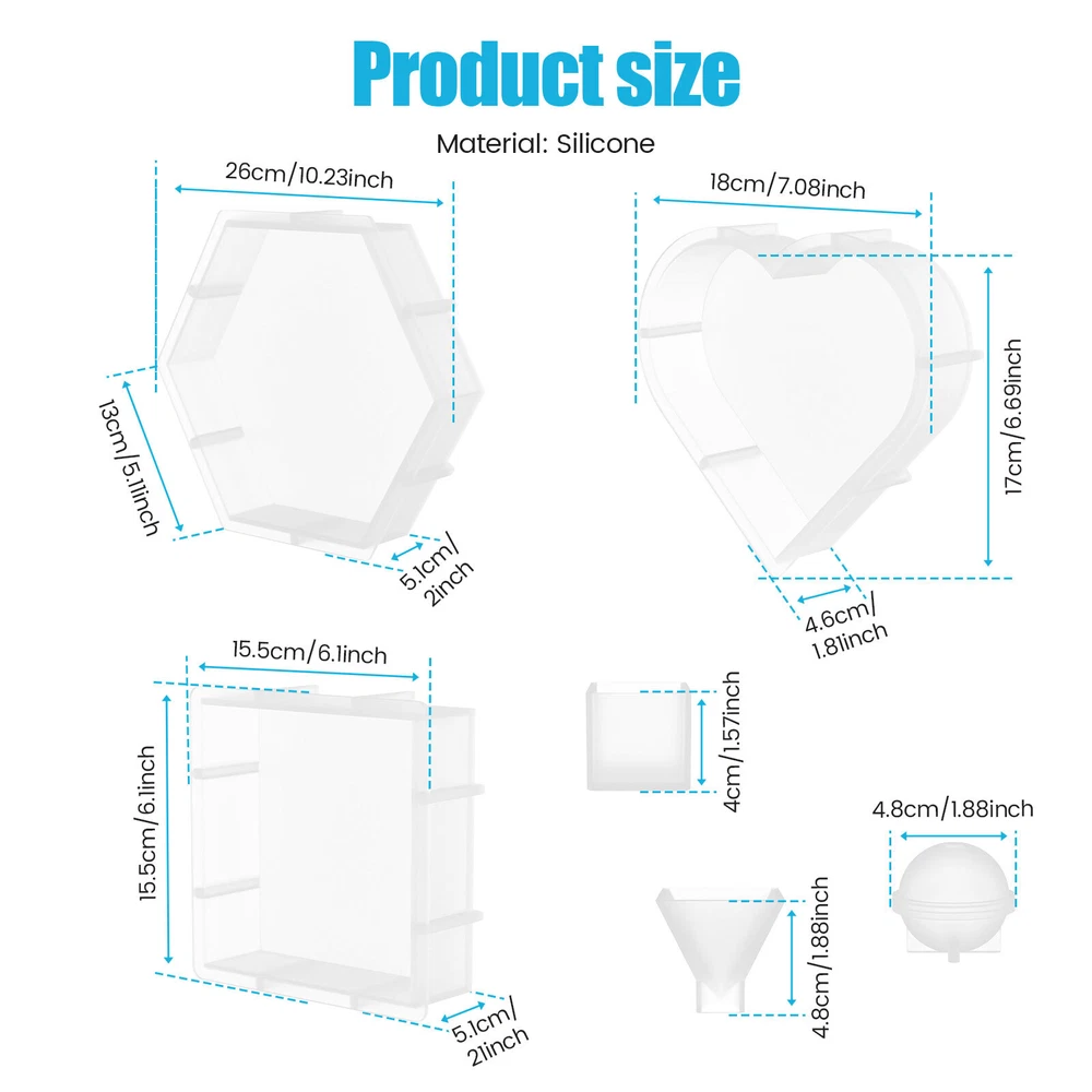[---Welcome TO Our Store! Happy Shopping! Happy Life---] Highlight description: Set Contains: Each set contains 3 large molds, heart, square and hexagon, including 3 small molds, ball, cube and triangle High Quality Material: This silicone mold is made of food-grade silicone material, safe and high temperature resistant, and can be used with confidence Easy to Use: This silicone mold set is safe in material, easy to use and release, and will not deform easily Soft: Our silicone mold can withstand the temperature of -40° to 270°. The mold is soft and it can be pulled at will, not easy to deform, and can be reused Versatile: The set contains 6 different shapes of molds. You can make a variety of different shapes of products by using the imagination and creativity Detailed description: Description: This silicone mold consists of food-grade silicone and is safe and high temperature resistant. And it's easier to release. It is soft and can be pulled at will, not easy to deform, but also can be reused. You can use them to make many different shapes. Key Feature: Soft: Our silicone mold can withstand the temperature of -40° to 270°. And it is soft as well as can be pulled at will, not easy to deform, and can be reused. Easy Release: This silicone mold set is safe in materials, easy to use, easy to release, and does not deform. Specification: Product Name: Resin Molds Materials: Silicone Size: Hexagon - maximum 26 cm, side length 13 cm, height 5.1 cm; Heart shape -17 x 18 x 4.6 cm Square -15.5 x 15.5 x 5.1 cm Spherical - diameter 4.8 cm; Triangular body - height 4.8 cm; Cube - Side length 4 cm Number of molds: 6 Note: 1. There may be slight color differences between the product picture and the actual item. We will do our best to display the color as accurately as possible. 2. Please allow slight dimensional discrepancies due to manual measurement. Parts List: 6 x Resin Molds We accept Payoneer/Mastercard/VISA/Google Pay/American Express etc. Immediate payment is needed, so that we can finish your orders, then dispatch and post them in time. We really appreciate your business with us, and hope to keep it lasting. Orders will be processed and dispatched within 1-5 working daysafter payment received from Monday to Friday. Saturday and Sunday orders will be posted in the following Monday. when items are in peak period, the time will be prolonged according to certain situations, which may beyond our control, but we are always ready to help you track the delivery info. Returns: 1.Defective goods must be returned within 30 days from the delivery date. The buyer is responsible for the return shipping fee. We will not reimburse the return shipping fee unless when we have shipped the wrong item.