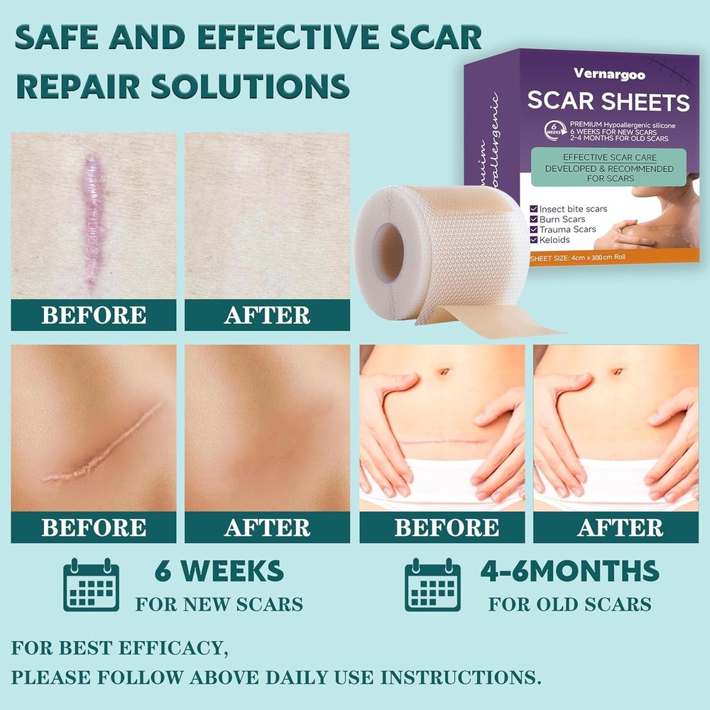 Silicone Scar Sheets,(1.6" X 120" Roll- 3M) 1.6" X 120" Roll - 3M Product Details Package Dimensions : 2.2 x 2.2 x 2.2 inches; 1.76 ounces Manufacturer : Vernargoo Country of Origin : China 【 High Quality and Easy to Use 】: Our silicone scar sheets are made of hospital grade soft silicone, which is soft and easy to cut, and can adapt to any scar size or shape through cutting, with precise and convenient application. Non irritating, easy to use and remove. 【Ideal Choice for Different Scars】: Smooth and soften scars by applying pressure and enhancing texture. Effectively manage surgical scars, including hypertrophic scars, keloids, burns, and cesarean section scars. 【Reusable and Breathable】: Our scar sheets are soft, flexible, and adaptable, creating a closed, moist healing environment. It won't affect your daily activities such as bathing, sleeping, and exercising. 【High Safety】: Made of 100% soft medical grade silicone, it helps maintain skin moisture and moisture in scar areas, suitable for both new and old scars. 【Medical Grade Silicone】: Silicone is a recommended scar treatment ingredient for plastic surgeons, hospitals, burn centers, and dermatologists.