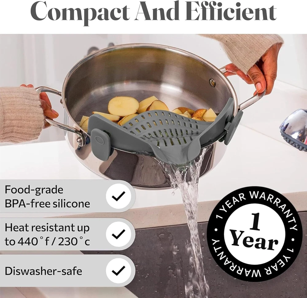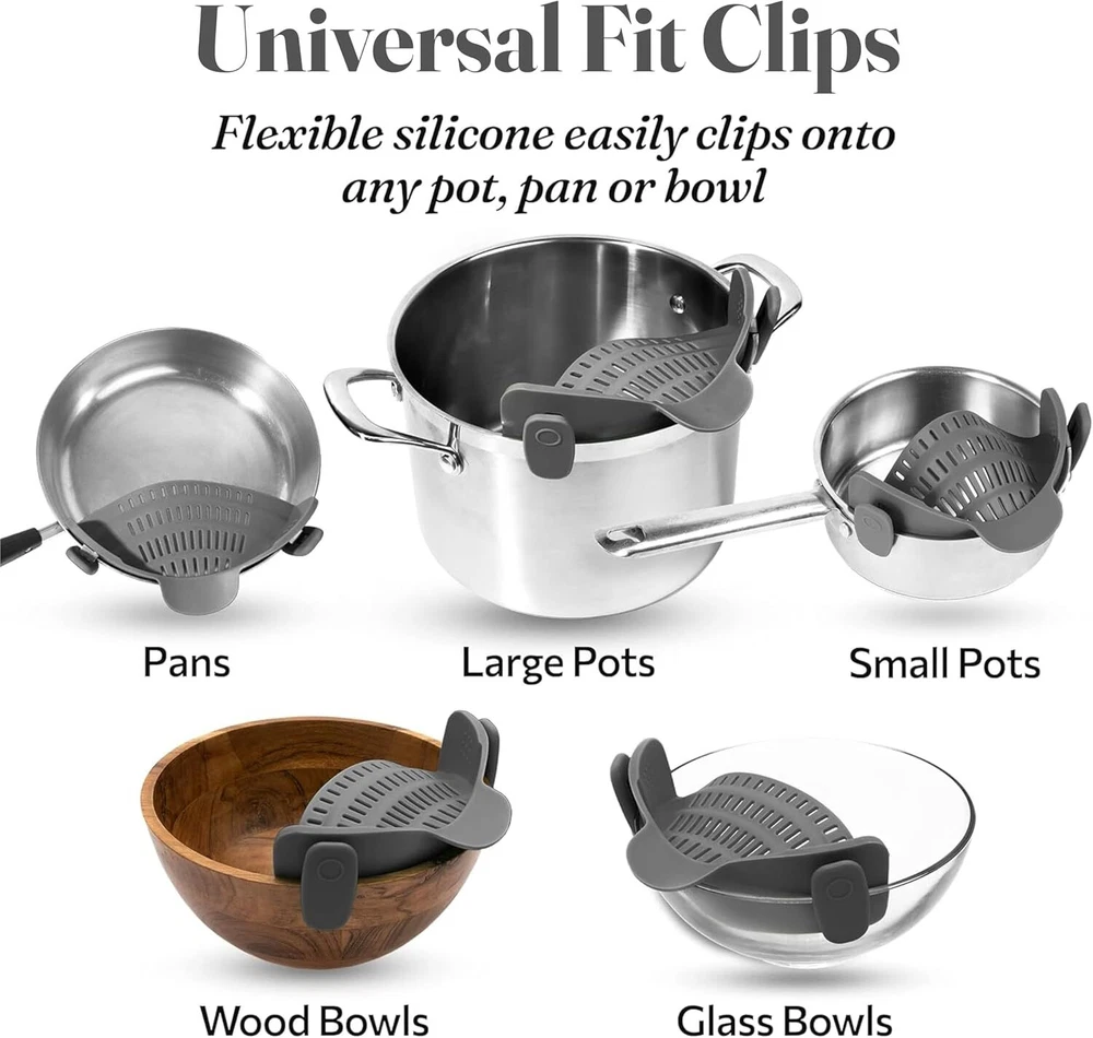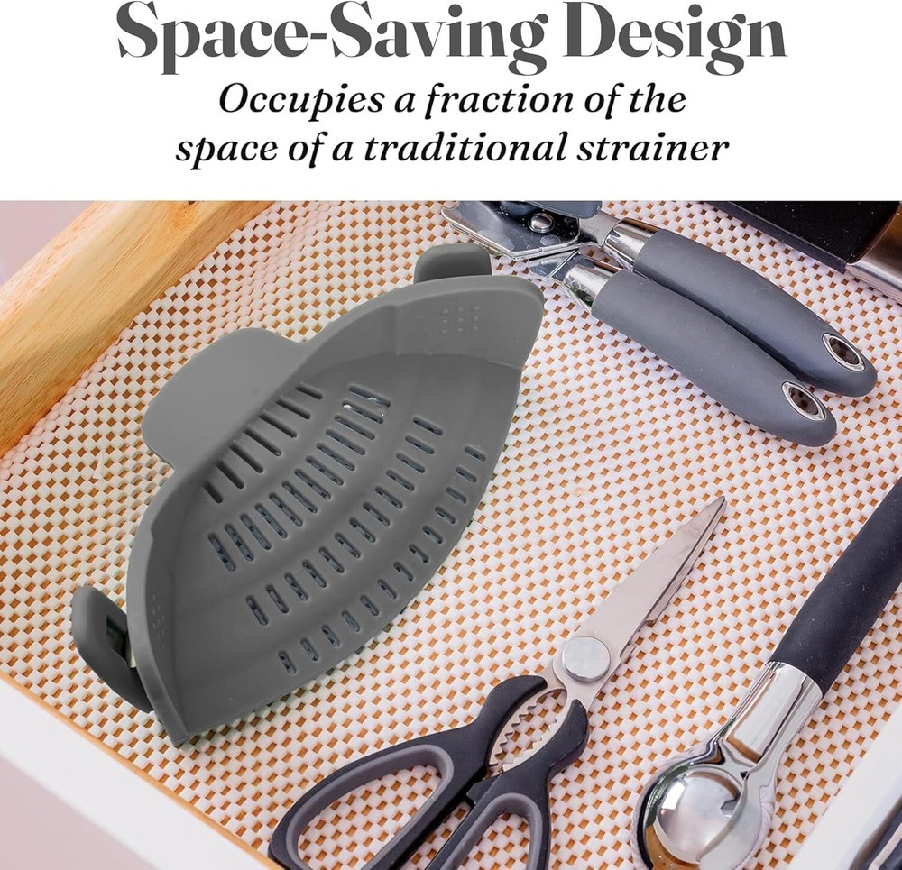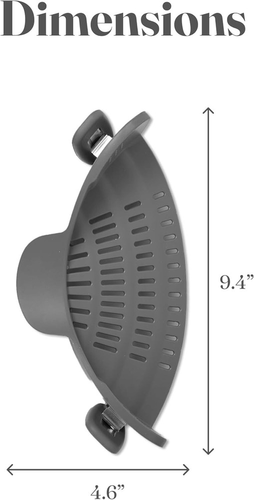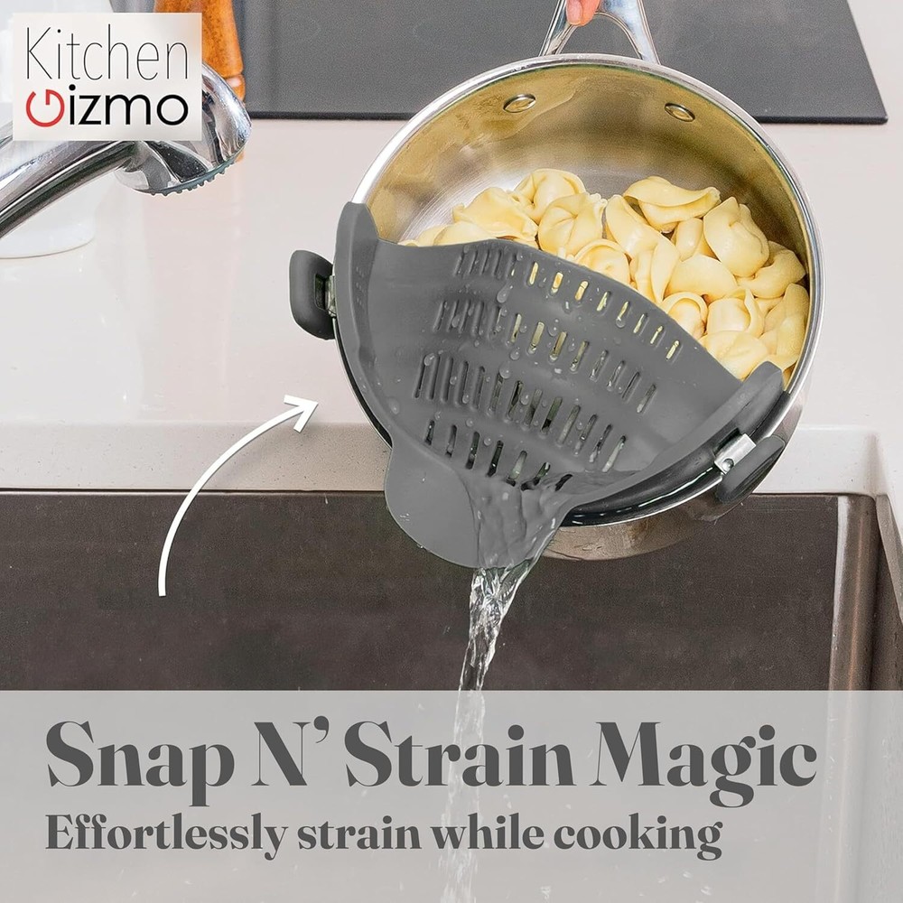 Kitchen Gizmo Snap N' Strain - Silicone Pasta Strainer Clip-On for Pots Gray Product Details Material: Silicone Color: Gray Brand: Kitchen Gizmo Style: Snap On Product Dimensions: 10"L x 5"W x 2.5"H Item Weight: 200 Grams Is Dishwasher Safe: Yes Manufacturer: Kitchen Gizmo Item Weight: 7.1 ounces Item model number: Kitchen Gizmo Is Discontinued By Manufacturer: No Fabric Type: Plastic Care instructions: Dishwasher Safe Assembly required: No Number of pieces: 1 Batteries required: No Included Components: Pouring Shield Plastic Hands-Free Straining: Clip on strainer easily snaps onto pots, pans, and bowls; keeping your hands free; great addition to your strainers and colanders collection; simple for draining pasta or veggies Compact and Space-Saving: Unlike traditional strainers, this collapsible strainer clips on and takes up minimal space. It’s the go-to solution for limited kitchen storage or camping trips Heat Resistant: Made from heat-resistant silicone; it can handle temperatures up to 400°F/230°C. This pot strainer stays strong, giving you a sturdy grip while draining hot foods without bending Compatible with Most Cookware: Specially designed to attach to most pots, pans, and bowls; this clip-on strainer for pots is versatile. Its universal design suits any kitchen task, big or small Durable and Dishwasher Safe: This pasta strainer is crafted from silicone; this kitchen tool is sturdy yet flexible, making draining easy. Simply rinse or pop it in the dishwasher for easy cleaning