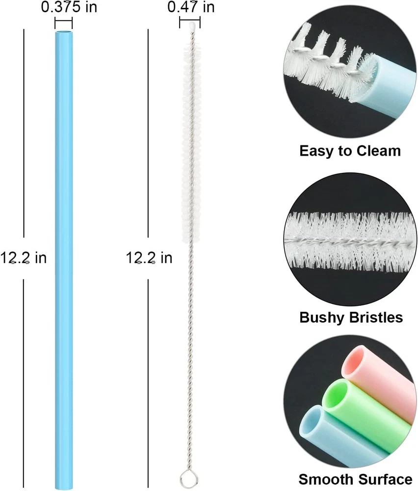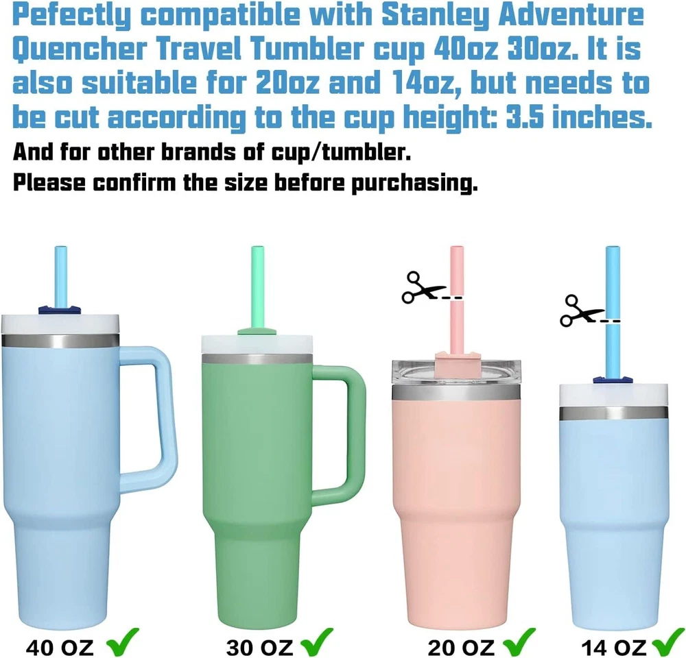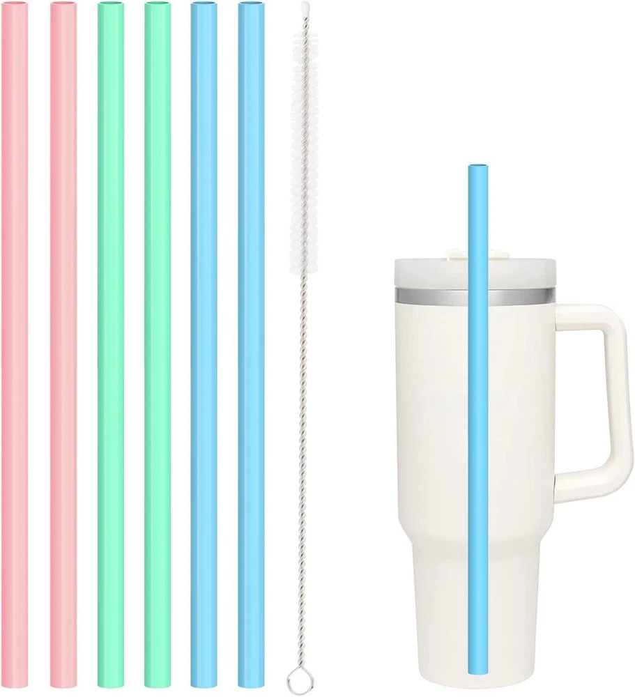 Silicone Straw Replacement for Stanley 40 oz 30 oz Tumbler Cup, 6 Pack Reusable About this item Compatible: 12.2" length x 0.375" wide , 6 counts long silicone straws plus one cleaning brush. Pefectly compatible with Stanley Adventure Quencher Travel Tumbler cup 40oz 30oz. It is also suitable for 20oz and 14oz, but needs to be cut according to the cup height: 3.5 inches. Food Grade Material: Made of food grade silicone material as the prototype, BPA free, odorless, thick and reusable. Dishwasher Safe and Easy to Clean. Easy To Clean & Dishwasher safer: Our silicone straws come with cleaning brush which is long enough to clean the whole straw, It helps keep your straw in its pristine condition at all times. Dishwasher safe. Widely Applications: It is not only suitable for Stanley cups, but also for other brands. Please confirm the size before purchasing. Guaranteen:If you are not satisfied with our products or have quality problems. If there is any problem with the product and service, please contact us as soon as possible and we will deal with it within 12 hours! Product Description