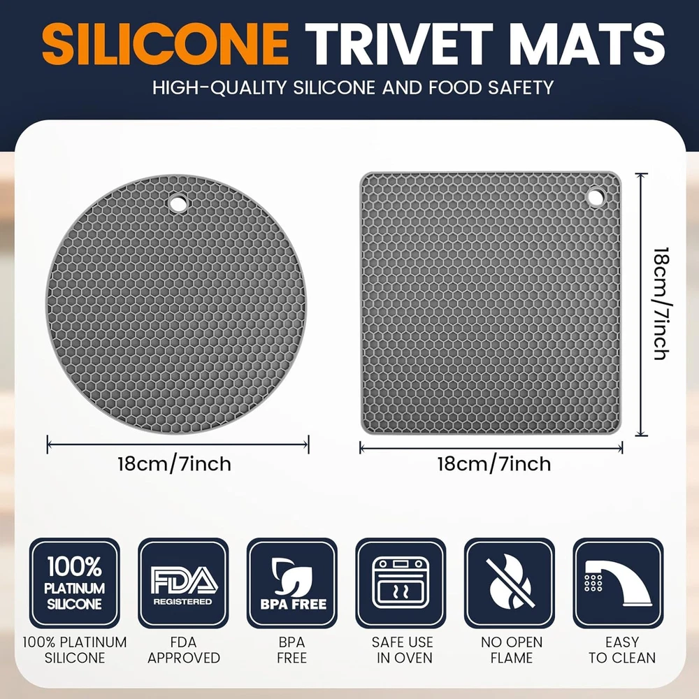 Store New Arrivals Add to Favorite View Feedback Contact Silicone Trivet Mats 4 Heat Resistant Pot Holders Multipurpose Non-Slip Hot Pads for Kitchen Potholders, Drying Mat, Jar Opener, Spoon Holder, Coaster.(Dark Grey) Description Item model number Fulee-001 Color Dark Grey Material Silicone Country of Origin China Item Weight 12 ounces Batteries required No Shape Square & Round Product Dimensions 7"L x 7"W x 0.24"Th Product Care Instructions Machine Wash, Hand Wash Only 1、High-quality silicone and food safety: Silicone pot holders for hot pots made of food grade silicone, BPA free, flexible and long-lasting,premium silicone material ensure that they won't rust. 2、Non-slip and high heat resistant: These trivets for hot dishes are heat-resistant from -104℉ to 446℉, Protect your countertop or table from hot pots, hot pans coming out from the microwave or stove. Silicone trivet is non-slip to make nothing slide off. 3、Easy to clean and store: The pot holder is hand and dishwasher washable. Almost everything can easily wash off the non-stick surface and quickly dry. You can stack, roll up or hang on to store,easy and save space.A must-have kitchen essentials you will need. 4、Multi-Purpose Trivets: Our silicone tripod is non-slip and flexible, making it an indispensable cooking accessory in the kitchen.It can be used as silicone mats, potholders, drying mat, jar opener, spoon holder, coaster, microwave Mat…one pad can help you solve many tasks. 5、Protect Your Tabletop: Our placemats are designed to protect your table or countertop from damage caused by hot dishes, pots, or pans. They also help prevent scratches and stains, keeping your surfaces stay looking as good as new. Product Description ABOUT US We offer the best prices around on high quality products. Our E-store includes media such as books, movies, music and games while offering electronics, toys, sporting apparel, clothing, tools, general home, garden items and more. SHIPPING We are always working hard to ensure your package arrives as soon as possible. Please understand that some factors like weather, high postal traffic, and the performance of shipping companies are outside of our control. We offer free shipping to the lower 48 states and ship within 2 business days of payment, usually sooner. We do not accept P.O. Boxes. Please provide a physical address. RETURNS We offer a 30-Day Return Policy on items which you are not completely satisfied with. You have the option for a full-refund or an exchange of the item. No returns are available on items shipped outside of the USA. PAYMENT We accept PayPal. CONTACT US This page content is yet to come Please ad us to your favorite seller and visit again later Thank You CUSTOMER SATISFACTION We try our very best to make sure every customer is completely satisfied. If there's a problem, message us! We're happy to help.