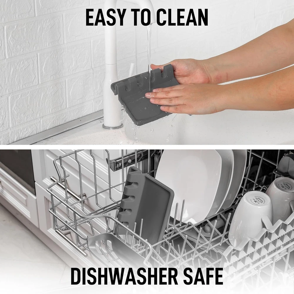 Silicone Utensil Rest with Drip Pad for Multiple Utensils, Medium, Gray Product Details Pattern: Classic Item Weight: 107 Grams Is Dishwasher Safe: Yes Material Type Free: Bisphenol-A (BPA) Free UPC: 63 76 Product Dimensions: 5.5 x 5.5 x 1.6 inches Item Weight: 3.77 ounces Manufacturer: Zulay Kitchen Item model number: Silicone Utensil Rest Is Discontinued By Manufacturer: No Material: Silicone Color: Gray Brand: Zulay Kitchen Product Dimensions: 5.4"L x 5.4"W Finish Type: Non Stick KEEP YOUR COUNTERTOPS CLEAN: Are you tired of random oil and sauce drips all over stovetops and kitchen counters while cooking? Say no more! Our spoon rest has raised edges to catch all the drips, making it a great addition to your kitchen gadgets for keeping counters and stoves splatter-free. Revolutionize your cooking, baking, or grilling experience with this beautifully designed square spoon holder. CLUTTER-FREE COOKING SESSION: With four slots, you get enough space to park your cooking utensils and keep them separated when multitasking in the kitchen. Use this cooking utensil holder for spoons, spatulas, ladles, brushes, tongs, or forks. Avoid running around finding the right tool, and keep your kitchen utensils closer for a stress-free time while cooking. HEAT RESISTANT AND EASY TO CLEAN: Made from food-grade material, this silicone spoon rest can be placed near the stove or countertop without it being affected by heat. It is designed with a non-slip base to prevent it from sliding and causing chaos while cooking. Once you are done with cooking, toss the kitchen tool holder in the dishwasher for a quick cleanup.