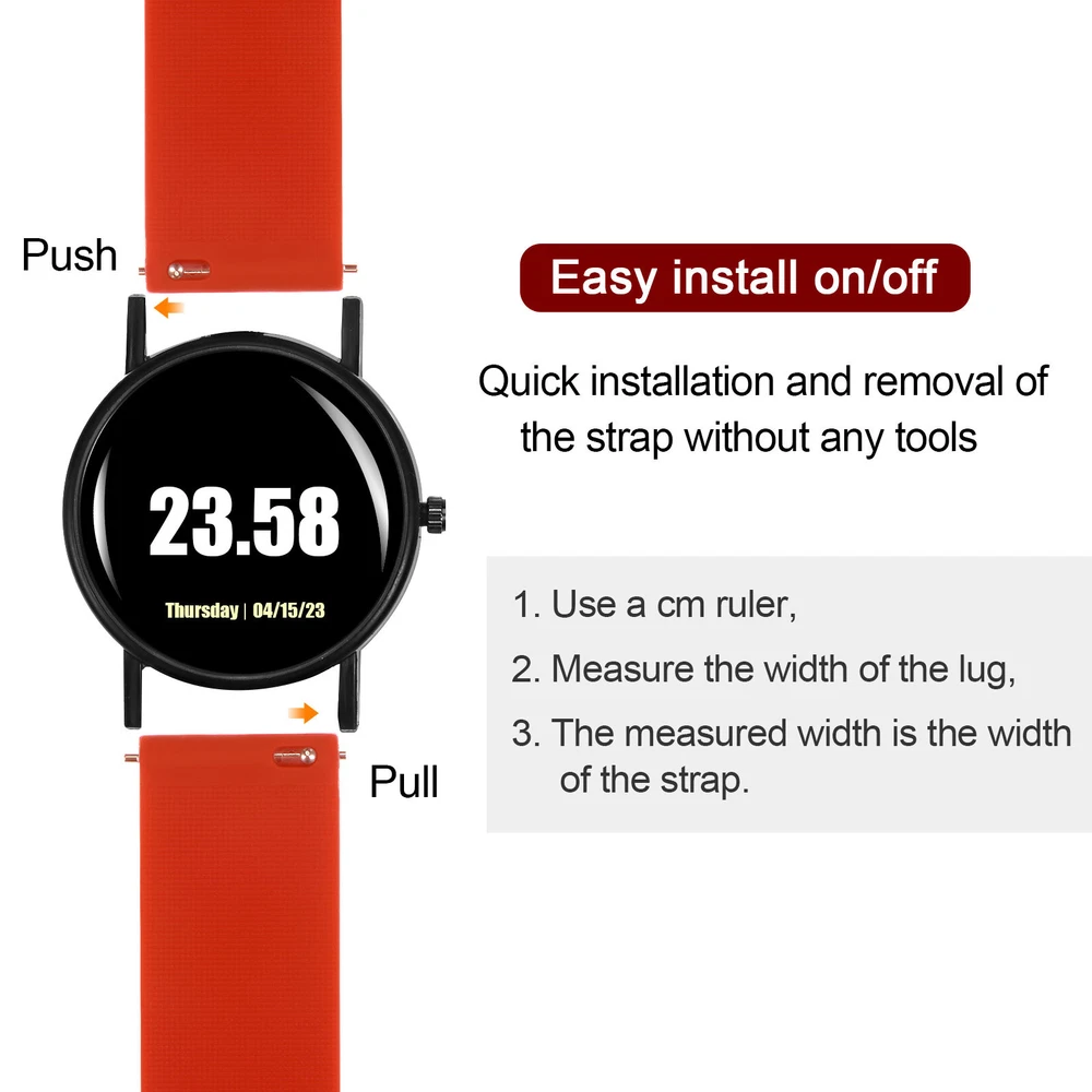 Document The soft strap is made of silicone rubber with polished stainless steel buckle, sweat, rain, and water resistant for swimming, diving, and other high-intensity workouts.Quick-release spring bars allow you to swap straps in seconds without any tools, adding a new style replacement band to your watch.The silicone strap design is stylish, elegant and sophisticated, suitable for both men and women, making your watch look brand new. Our classic replacement watch straps fit any traditional or smart watch with 24mm width lugs.Please measure the width of your watch lug before ordering and your watch's lug width is the exact width of the band you select. Silicone Watch Band 24mm Quick Release Soft Rubber Watch Strap, Red The soft strap is made of silicone rubber with polished stainless steel buckle, sweat, rain, and water resistant for swimming, diving, and other high-intensity workouts. Quick-release spring bars allow you to swap straps in seconds without any tools, adding a new style replacement band to your watch. The silicone strap design is stylish, elegant and sophisticated, suitable for both men and women, making your watch look brand new. Our classic replacement watch straps fit any traditional or smart watch with 24mm width lugs. Please measure the width of your watch lug before ordering and your watch's lug width is the exact width of the band you select. Hot Item Payment 1.We accept eBay payment . 2.Payment must be received within 7 business days of auction closing. Shipping 1.We ship to your eBay or Paypal address. Please make sure your eBay and Paypal address is correct before you pay. 2.Items will be shipped within 1-3 business day when we received payment. 3.Delivery time depends on destination and other factors. Description Policy Silicone Watch Band 24mm Quick Release Soft Rubber Watch Strap, Red The soft strap is made of silicone rubber with polished stainless steel buckle, sweat, rain, and water resistant for swimming, diving, and other high-intensity workouts. Quick-release spring bars allow you to swap straps in seconds without any tools, adding a new style replacement band to your watch. The silicone strap design is stylish, elegant and sophisticated, suitable for both men and women, making your watch look brand new. Our classic replacement watch straps fit any traditional or smart watch with 24mm width lugs. Please measure the width of your watch lug before ordering and your watch's lug width is the exact width of the band you select. Hot Item Payment 1.We accept eBay payment . 2.Payment must be received within 7 business days of auction closing. Shipping 1.We ship to your eBay or Paypal address. Please make sure your eBay and Paypal address is correct before you pay. 2.Items will be shipped within 1-3 business day when we received payment. 3.Delivery time depends on destination and other factors.