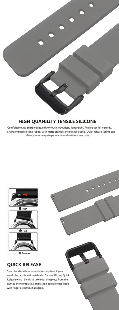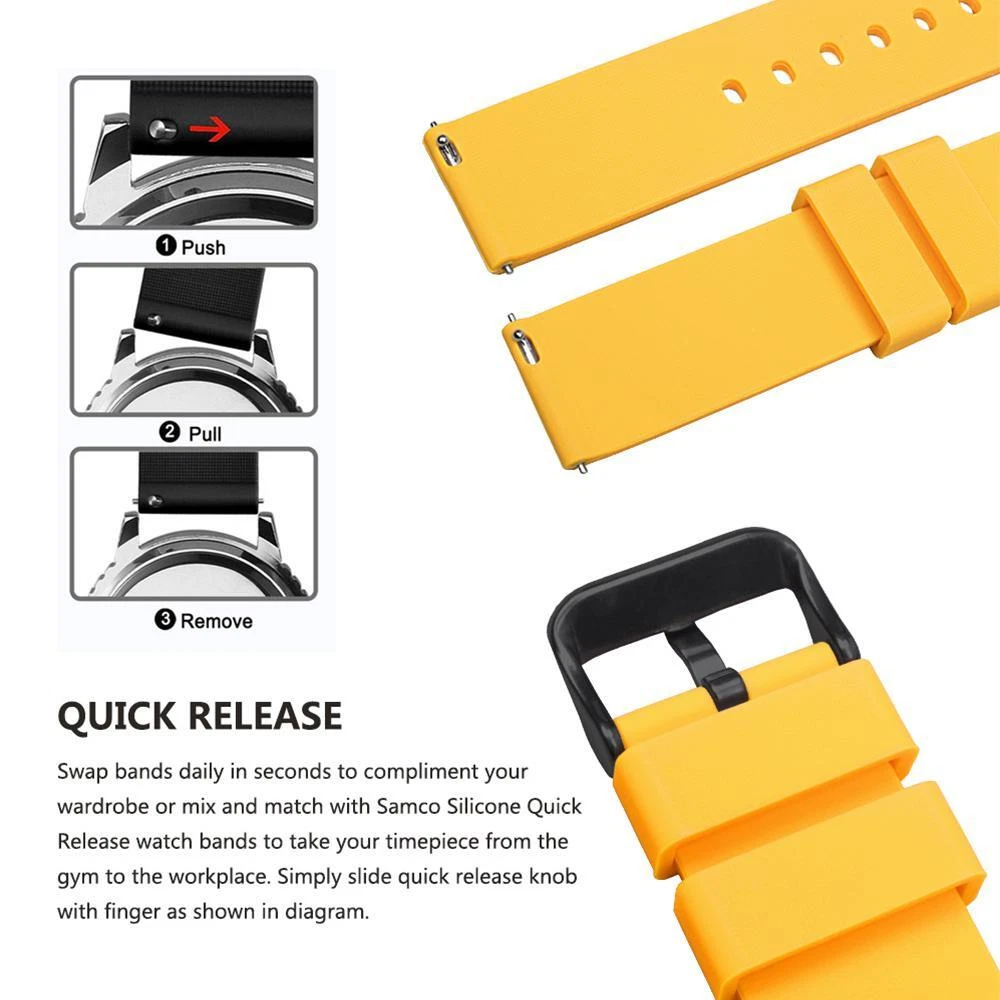 FREE SHIPPING 30 DAYS RETURN EASY PAYMENT Silicone Watch Bands 14-24mm Soft Quick Release Rubber Straps for Smartwatches BREATHABLE OUTSIDE SPORTS: Samco watch band is a stylish, soft and breathable watch accessory which can be used either in wet or hot weather. It is of good quality and reliable, and with its durable, dirt & wet resistant features, you can enjoy yourself with no concern while doing fitness, swimming, diving, or climbing. ALL SIZE AVALIABLE 12mm, 14mm, 16mm, 18mm, 19mm, 20mm, 21mm, 22mm, 24mm PERFECT FOR OUTSIDE SPORTS Textured back prevents slipping, improves comfort and airflow; Waterproof and washable (eliminate stink!); Perfect for fitness and active lifestyles SELECT COLOR AND SIZE Measure watch lug where band and spring bar meet the watch casing. It is important that your watch's lug width is the exact width of the band you select or spring bars will not fit correctly. SERVICE & BUYER PROTECTION - We hope you can finish your order payment as soon as possible , to make sure you can receive our high quality watch as soon as possible. - Custom/Import Taxes: Buyers are responsible for paying the duties, taxes or VAT (if any) in their country. The amount you paid excludes any custom tax. We usually declare as "watch(Gift)" when shipping to try to help you minimize any potential import taxes/VAT/GST. But we can't gurantee no tax charges, as it depend on your country's policy. - Items will be shipped as the payment being received.(Excluding Weekends and Public Holidays) - Full refund if parcel not received or returned. - Please contact our customer services executive before the item return. - The defective item could be returned within the warranty period AND with the original package. - Return items must not be used. - Buyer is responsible for all return shipping charges. Please view all photos along with reading this description. If there is anything I need to clarify, feel free to ask questions. so please keep checking my items for sale. Dear Customers, you will receive exactly the same item which you see on the pictures, not similar or other. This is a lovely item to own or to give as a special gift. For any questions please contact us !! Handling Time: 1-5 Business day. Returns I check myself each product and sell only the best quality products. In any case, if you are not satisfied with the product, first, please contact me and I will do everything to your satisfaction. In any case you have a 100% Guarantee and refund. I accepted within 30 days, In its original packaging and on condition the item is its original condition as received. buyer pay for shipping and all additional payments such as tax. My customers are very important to me! please, In case of any problem or question, please feel free to contact me and I will do everything I can to make you be satisfied! Thank you for shopping REVIEWS great and looks great! Excellent quality. Fast shipping. Will buy from again soon. THANKS!!! Delivery was fast. Excellent seller, great communication. I advise everyone