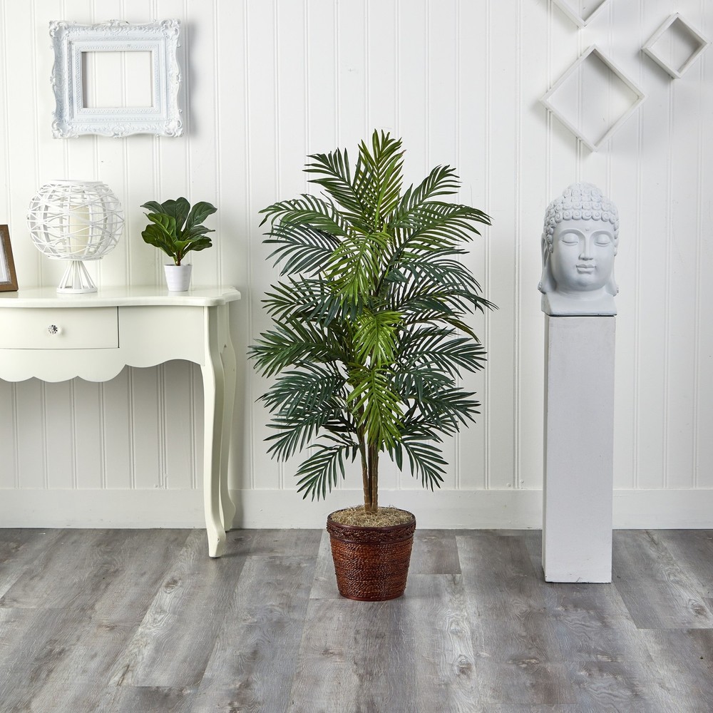 Add exotic Asian beauty to your home decor with an Areca Palm tree Silk plant features slender wispy leaves on carefully crafted stems Decorative accessory stands 56 inches tall and adds taste to any space Planted in a stylish wicker basket filled with artificial moss Meticulously crafted from the finest materials Makes a great housewarming giftMeasures 56 inches high x 32 inches wideBasket measures 9 inches high x 10 inches wide Free Shipping Over $49.99* Details Silk Areca Palm Tree - Green Product Description: Add exotic Asian beauty to your home decor with an Areca Palm tree Silk plant features slender wispy leaves on carefully crafted stems Decorative accessory stands 56 inches tall and adds taste to any space Planted in a stylish wicker basket filled with artificial moss Meticulously crafted from the finest materials Makes a great housewarming gift Measures 56 inches high x 32 inches wide Basket measures 9 inches high x 10 inches wide