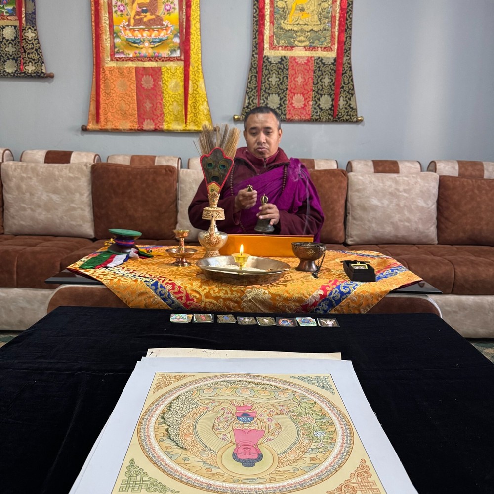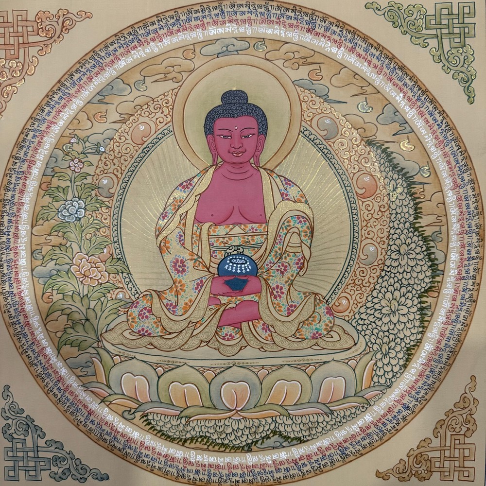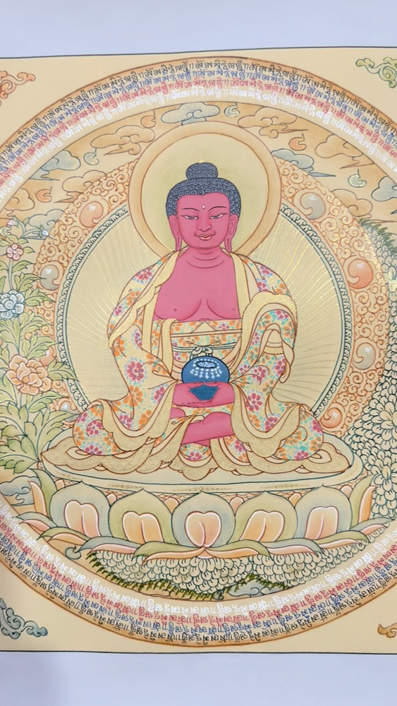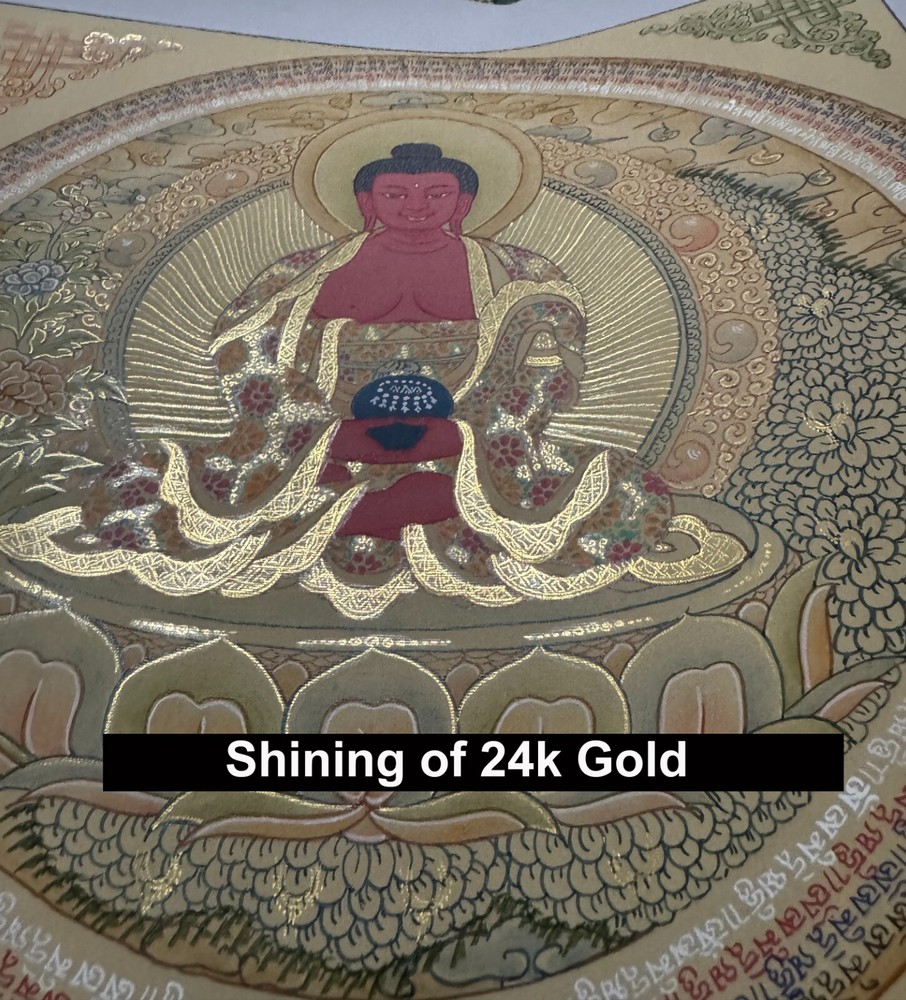 Namaste and Welcome to my Gallery!!! All of the paintings and arts in my gallery are originally handmade and hand-painted by my family members and other local artists who have been practicing their craft for over two decades. My father is Master Artists Nepal with an experience of more than four decades; you can see some of his work in this Gallery. Also you can see some of the beautiful and soulful artwork of talented local artists from Himalayas. ~ Amitabha Buddha Mandala ~ Amitabha Buddha is being portrayed as Shakyamuni Buddha but usually, he is often depicted seated in meditation mudra while earth touching mudra is reserved for a seated Shakyamuni Buddha alone. In Tibetan Buddhism, Amitabha is red in color (red being the color of love, compassion, and emotional energy). He is being known to protect beings from the negative emotions of attachment his unique emblem is the lotus. He is thus associated with the attributes of the lotus: gentleness, openness, and purity. Amitabha is known as the red Buddha of the west and the most ancient among the Five Dhyani Buddhas of the Vajrayana tradition. Amitabha means infinite light and he is also known as “Amitayus” or Buddha of the infinite life. Mandala is a geometric pattern of squares & concentric circles as a projection of the cosmos. The basic form of mandalas is square with four gates containing a circle with a center point. Mandala is regarded as a place separated and protected from the ever changing and impure outer world of samsara. [Size = 75 cm x 58 cm] Material Used: • Cotton Canvas • Natural Pigments and colors • 24k Gold leaf • Silk Fabric ~Excellent for meditation or home/office decor, ~Tibetan Yoga Wall Art ~Genuine 100% hand-painted from Himalayas