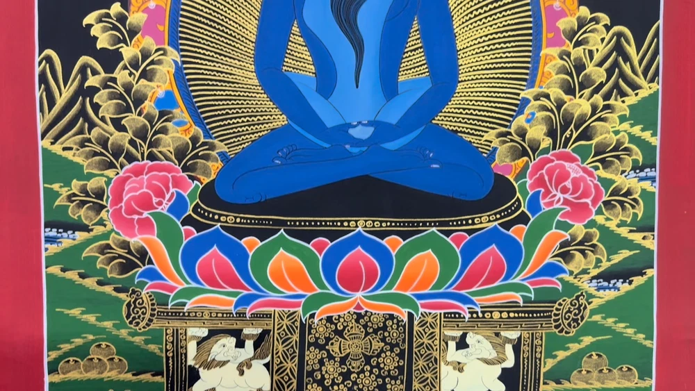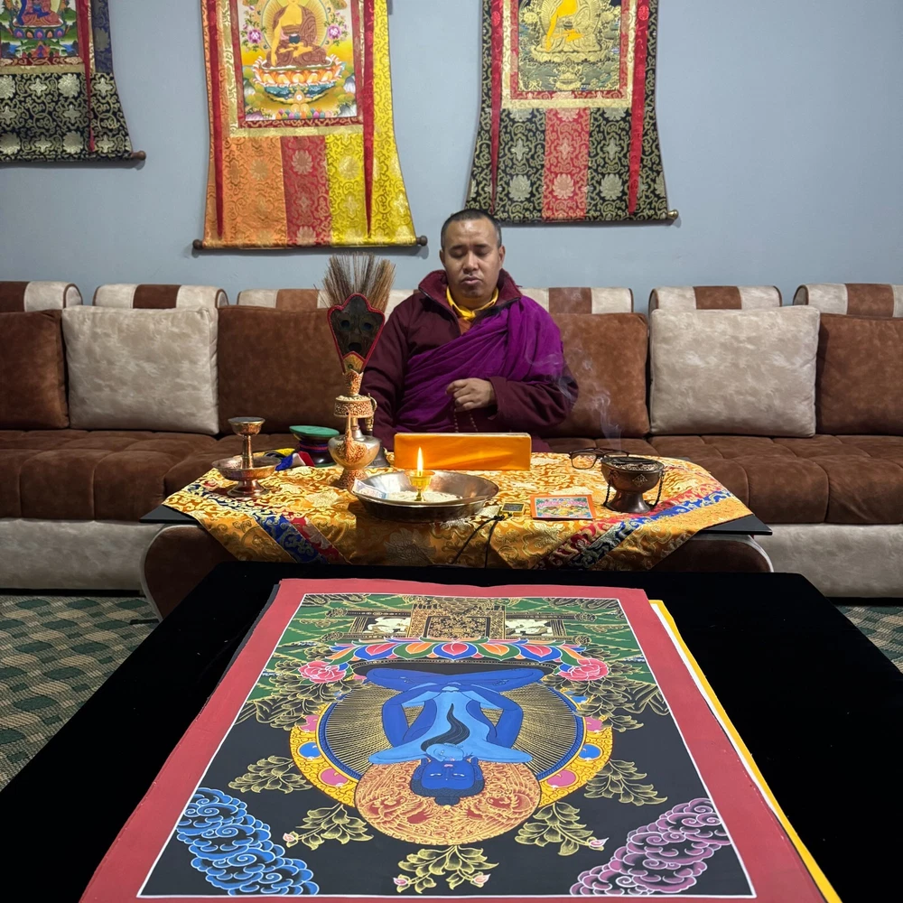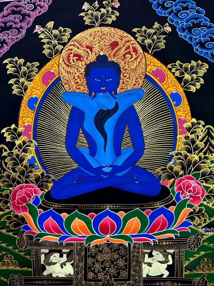 Namaste and Welcome to my Gallery!!! All of the paintings and arts in my gallery are originally handmade and hand-painted by my family members and other local artists who have been practicing their craft for over two decades. My father is Master Artist from Nepal with an experience of more than four decades; you can see some of his work in this Gallery. Also you can see some of the beautiful and soulful artwork of talented local artists from Himalayas. ~~ Buddha Shakti Thangka~~ Silk brocading is a process of framing a Thangka in traditional Tibetan style. The frame is made of beautiful silk fabric having rich colors and patterns. The silk fabric protects the edges of the Thangka, and also makes it easier to hang. A thin silk cover protects the painting when rolled, and may be gathered up to display the painting when hung on the wall. It is generally thought that silk brocade renders a Thangka more attractive and more religious. Buddha Shakti is deep blue in color, symbolizing the sky or emptiness of mind. Samantabhadri or buddha’s consort is white in color, symbolizing the aspect of the clarity of our mind. The male female of Adi Buddha in union depict the unity of emptiness and cognizance. Samantabhadri is completely nude and while not ornaments symbolizing that she is free from all thought constructs. It means that enlightenment can be realized only when we are free from thought constructs and one perceives the empty nature of the mind directly. [Size = 122cm x 94cm] Material Used: • Cotton Canvas • Natural Pigments and colors • 24k Gold leaf • Silk Fabric ~Excellent for meditation or home/office decor, ~Tibetan Yoga Wall Art ~Genuine 100% hand-painted from Himalayas Please feel free to contact me if you have any question regarding the painting.