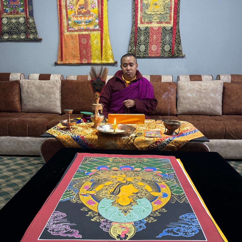 Namaste and Welcome to my Gallery!!! All of the paintings and arts in my gallery are originally handmade and hand-painted by my family members and other local artists who have been practicing their craft for over two decades. My father is Master Artist from Nepal with an experience of more than four decades; you can see some of his work in this Gallery. Also you can see some of the beautiful and soulful artwork of talented local artists from Himalayas. ~~ Prajnaparamita Thangka~~ Silk brocading is a process of framing a Thangka in traditional Tibetan style. The frame is made of beautiful silk fabric having rich colors and patterns. The silk fabric protects the edges of the Thangka, and also makes it easier to hang. A thin silk cover protects the painting when rolled, and may be gathered up to display the painting when hung on the wall. It is generally thought that silk brocade renders a Thangka more attractive and more religious. Prajnaparamita embodies the bliss/emptiness that gives rise to all phenomena—hence her title as The Mother of all Buddhas. She appears as a seated figure clothed in silks; her body is gold in color, and she has one face and four arms. Prajnaparamita has four arms; the two hands in her lap touch each other and form the mudra of meditation, and in the other two hands she holds the Vajra and the texts of the The Perfection of Wisdom Sutra (Prajnaparamita Sutra). [Size = 122cm x 93cm] Material Used: • Cotton Canvas • Natural Pigments and colors • Gold leaf ~Excellent for meditation or home/office decor, ~Tibetan Yoga Wall Art ~Genuine 100% hand-painted from Himalayas Please feel free to contact me if you have any question regarding the painting.