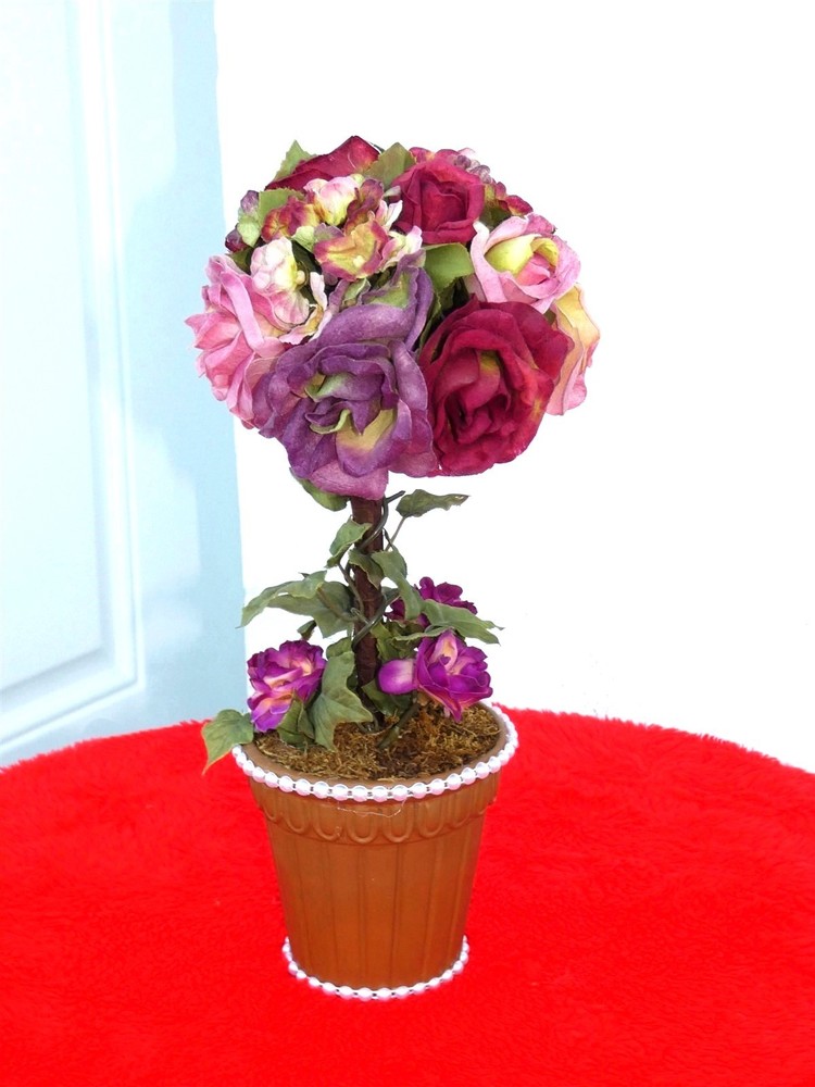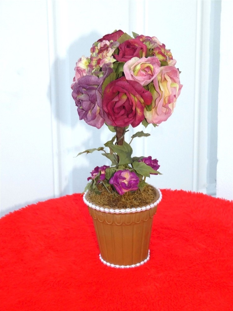 SIlk Flower Rose Topiary Tree Artificial Floral Shabby Cottage Victorian Silk Flower Rose Topiary Tree Multicolored Roses with green leaves In a Tan Resin Pot Has flux pearls around the pot top and bottom Measures: 13 inches tall 7 inches wide on top Would look great in any room Victorian or Shabby Chic Cottage Style In very good contrition PLEASE SEE PHOTO FOR MORE DESCRIPTION COMES FROM A SMOKE FREE HOME THANKS FOR LOOKING COME AND SEE MY other items Powered by SixBit's eCommerce Solution