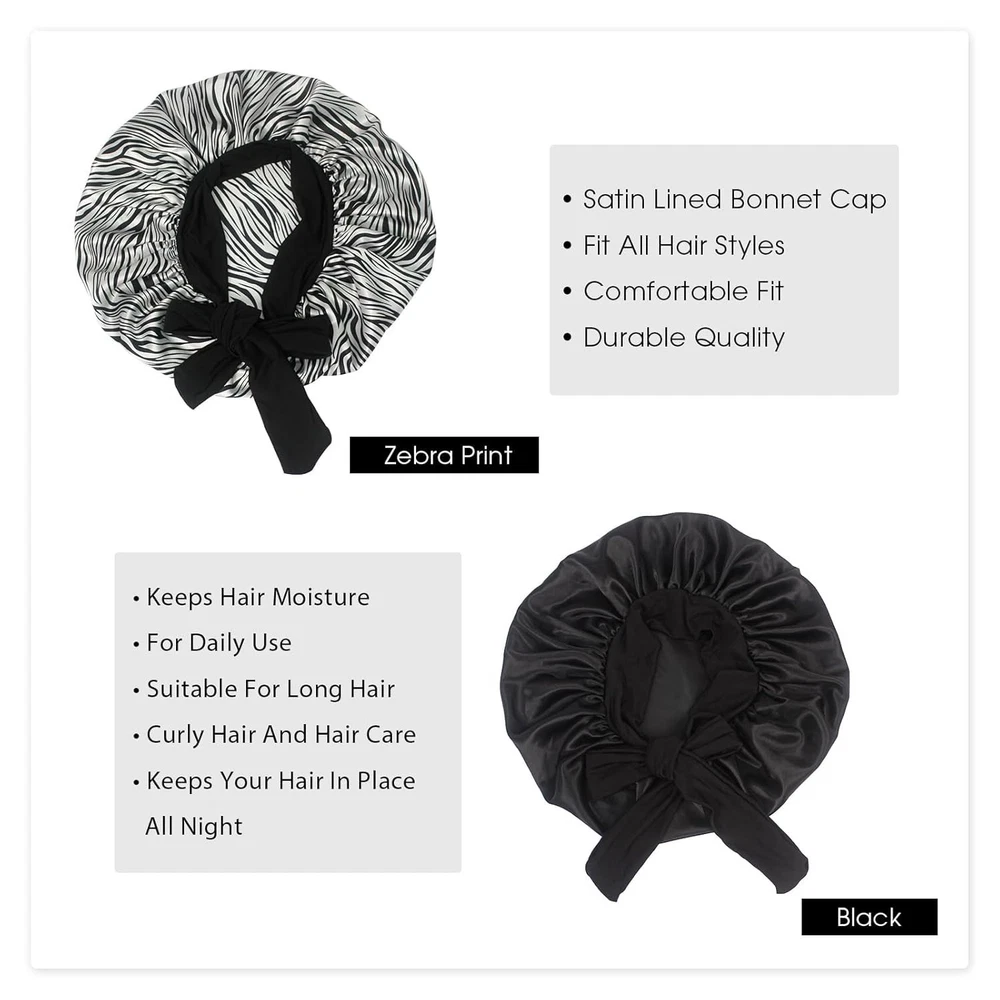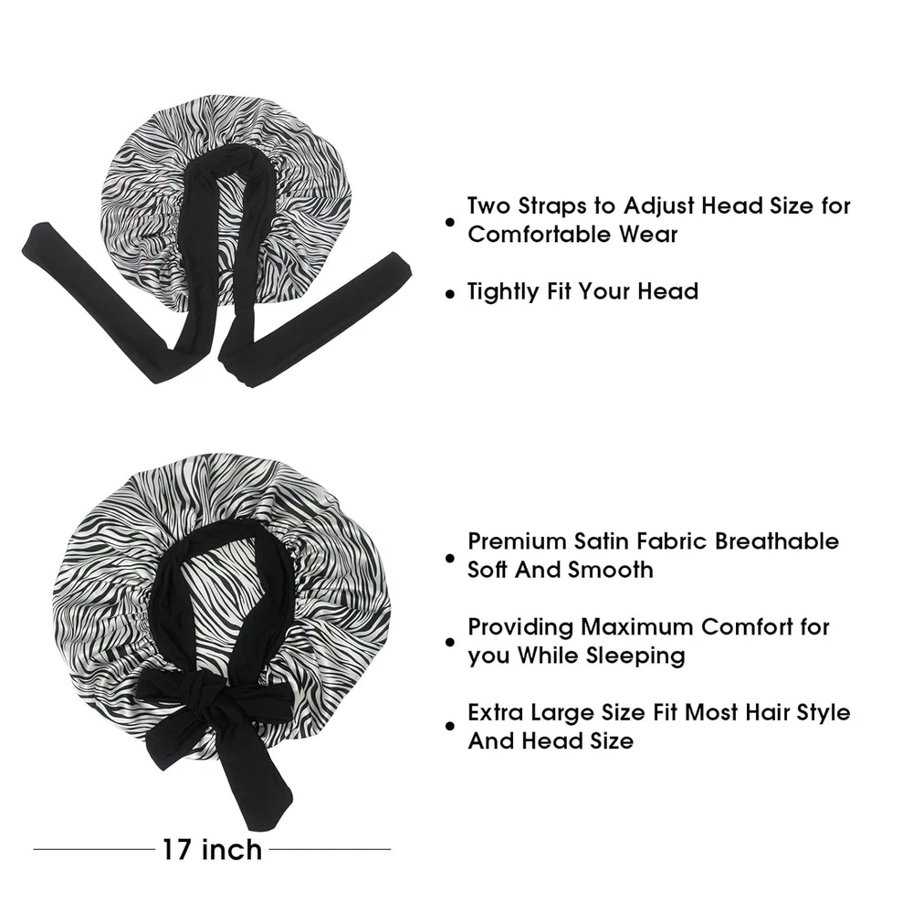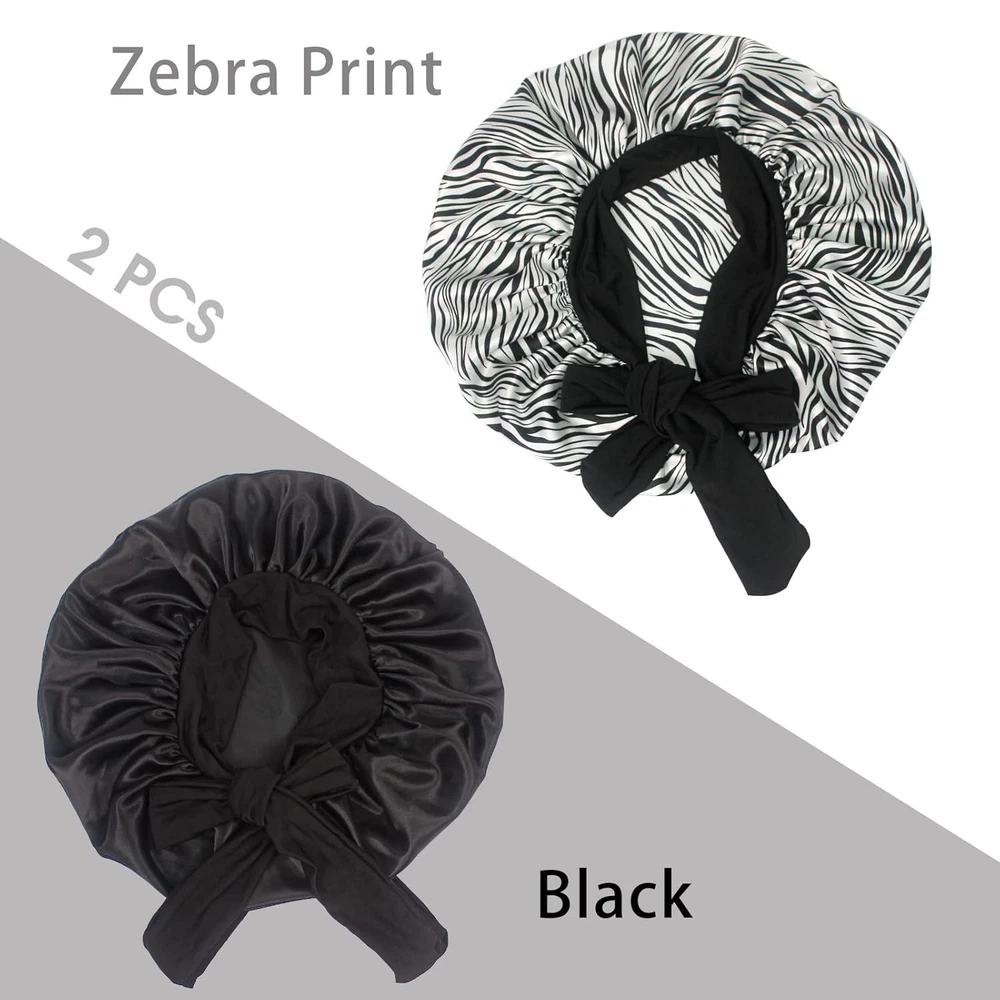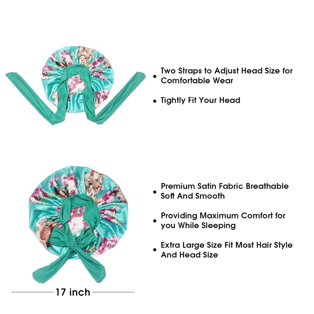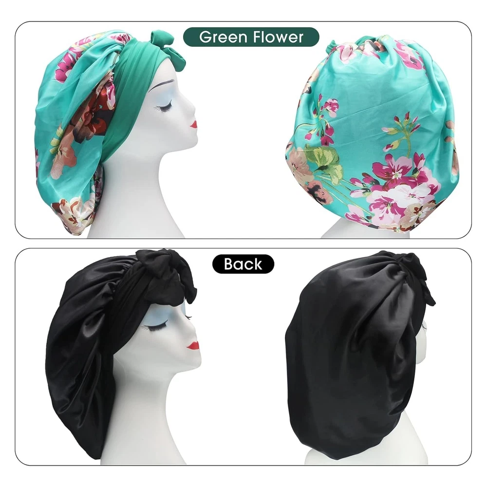 【Satin Bonnet with Stretchy Tie Band】- This silk satin hat has a soft elastic long strap, you can make tie and make bonnet firmly on head, it protects your hair well. He makes you feel comfortable. Sleeps all night and doesn't slide off your head while sleeping. Not too tight and breathable. Washable and no fade. 【Comfortable Fit】- Our shower and bath caps are designed with a concealed adjustable flexiband to ensure they are comfortable for all head sizes. They also feature an adjustable bow for added comfort and an enhanced fit, making them perfect for all hair lengths and types. You can also make a nice bow on the forehead or side using the soft wide band to make you unique and beautiful. 【Premium Fabric】- Our reusable shower caps are made from an innovative premium performance fabric which is latex-free, breathable, durable and made to last. The soft silky material adheres to the skin and has a soft texture, ideal for everyday use. 【Stylish and wide Use】- The elastic silk head scarf will keep your beautiful appearance at work, sports, parties and outdoor dinners. Suitable for many occasions, face washing, skin care, hairdressing, sleeping, housework, cooking, makeup, fitness, running, etc. 【Perfect Gift】- You can send these beautiful and practical sleep hats to your wife, mother, sister, girlfriend on birthday, Mother's Day, Thanksgiving Day, Anniversary, Christmas, New Year, etc. Set Includes : 17" 2 Pack Shower Caps (Black+Green Flower),