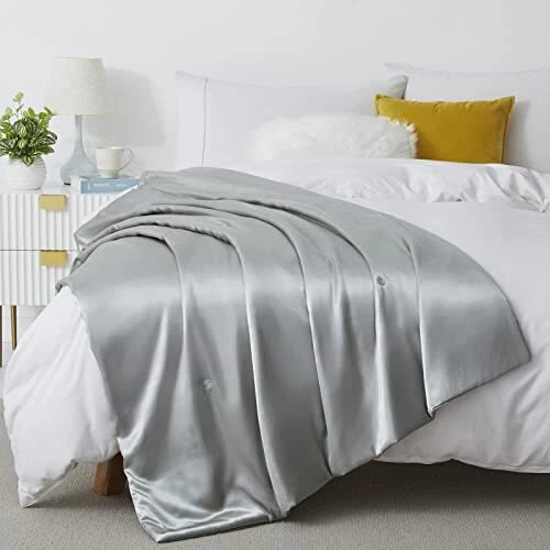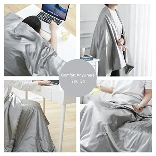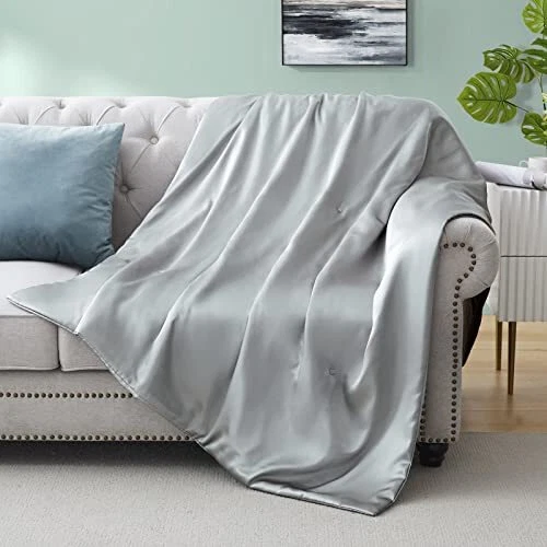 Silk Throw Blanket - Silver Grey Cooling Packable Satin Blanket for Couch, Be...