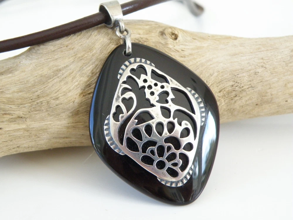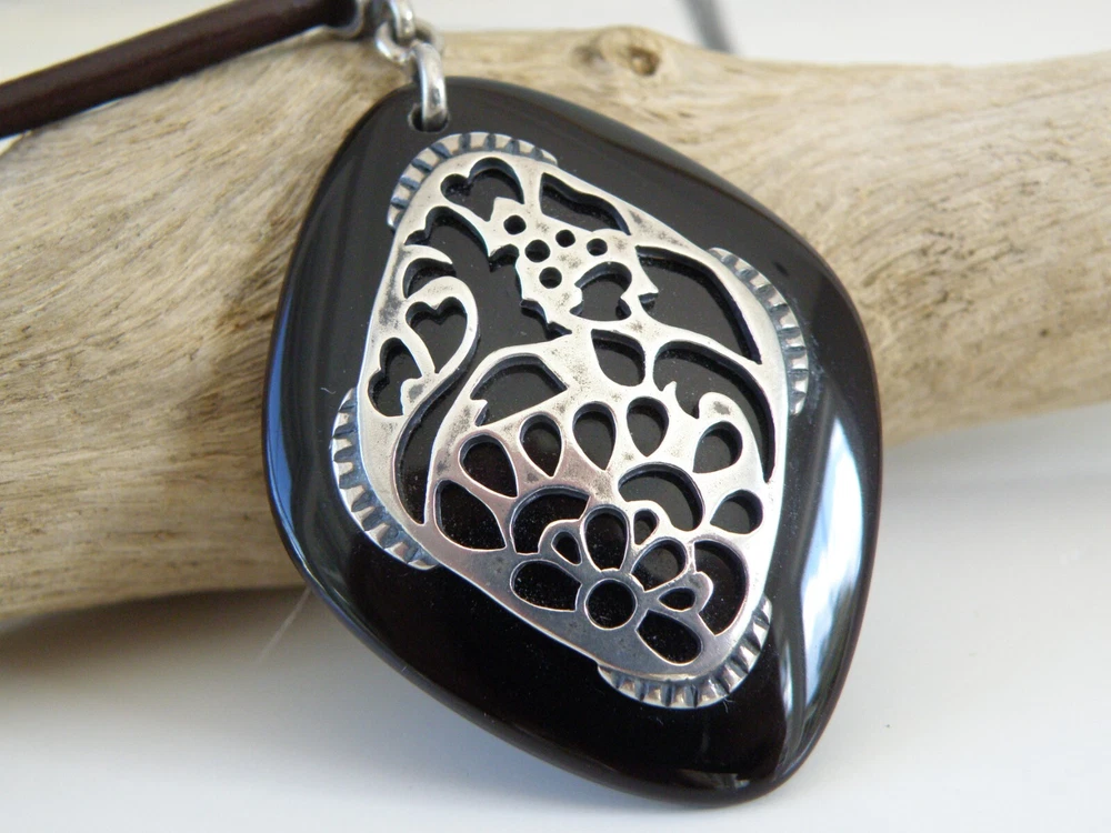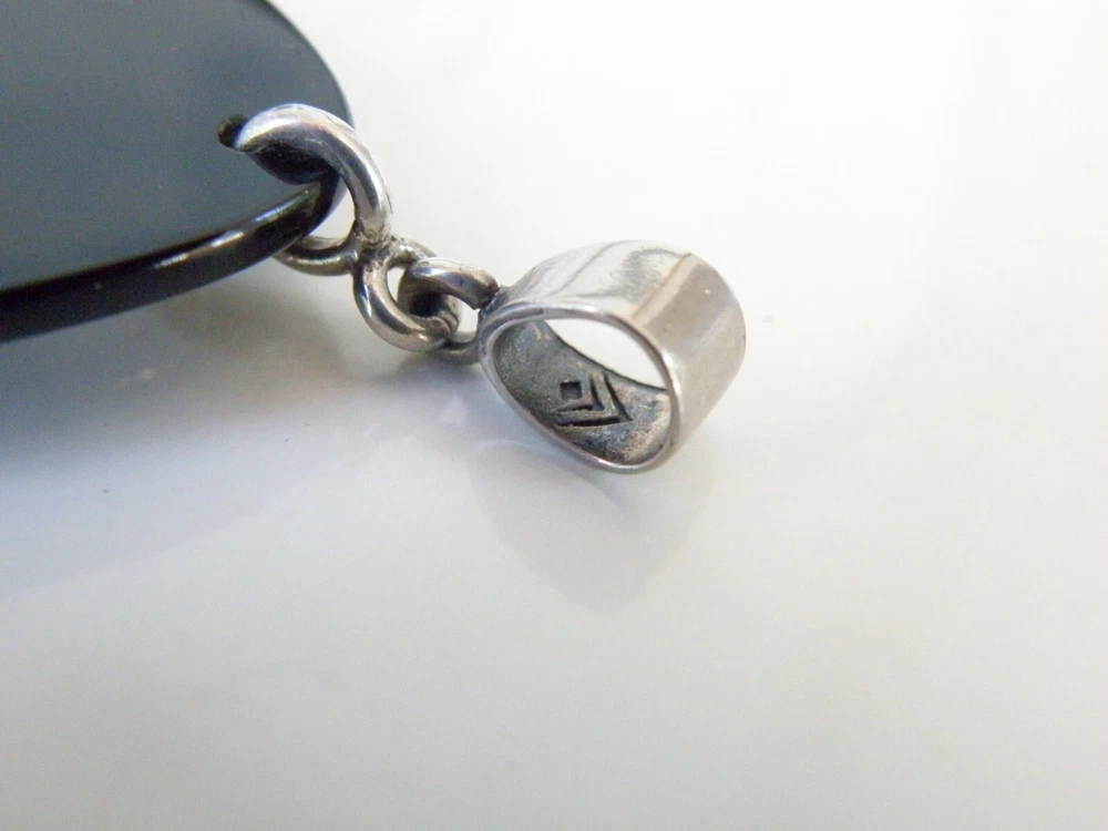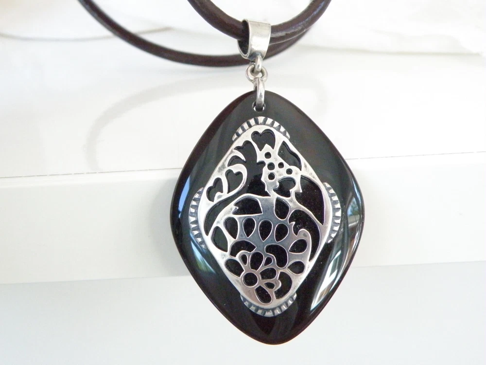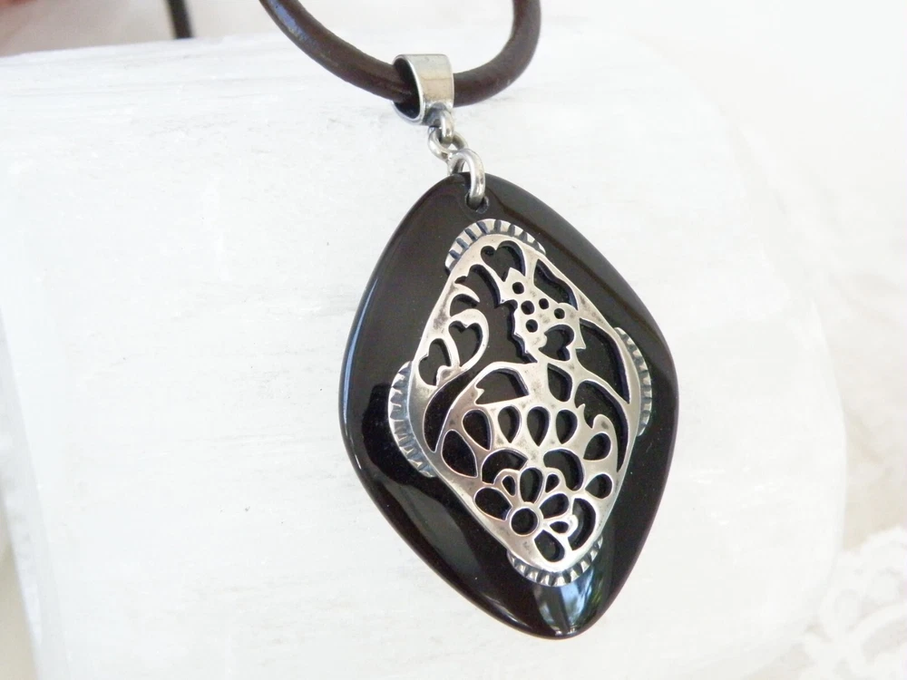 Beautiful Silpada Sterling Silver Black Pendant Perfect gift for someone special or for yourself. Please review all pictures, shipping/return details, listing details, and ask any questions before buying. I added the necklace - I believe it is leather. It is not sterling silver or Silpada. Measures approx. 2.28" with the bail x 1.28" widest. Necklace is approx. 18" long Marked for sterling silver and silpada inside the bail. Necklace is not marked Weight 18.4 grams combined