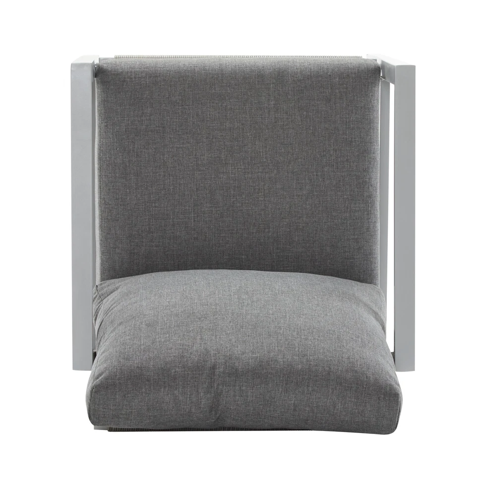 Product Features Sleek Modern Design: With clean lines and a minimalist aesthetic, this lounge chair features a bold aluminum frame complemented by elegant rope accents. Its sophisticated design enhances any contemporary outdoor or indoor space, from patios to living rooms Durable and Weather-Resistant Construction: Built with a powder-coated aluminum frame and tightly woven synthetic rope, this chair is designed to resist rust, fading, and wear, ensuring it withstands outdoor elements while maintaining its stylish appearance Exceptional Comfort: The thick, high-density seat and back cushions offer outstanding support and relaxation. The ergonomic design, including angled back support and armrests, makes it an ideal choice for lounging, reading, or entertaining Versatile and Functional: Lightweight yet robust, this chair is easy to move and perfectly suited for a variety of settings. Its modern design and durable construction make it a timeless piece for gardens, balconies, or indoor spaces, seamlessly blending style with functionality