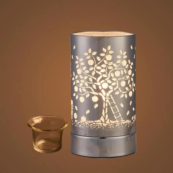 3 in 1 Silver Apple Tree Touch Lamp, Essential Oil Diffuser and Wax Warmer; Four levels of touch sensor variable lighting to choose, Includes optional scented oil and wax glass container, one 20watts 9G bulb, 120 V. ETL certified. Made of Stainless Steel and Glass. Size: 3.75 in. x 3.75 in. x 7 in. With 1 extra bulb.