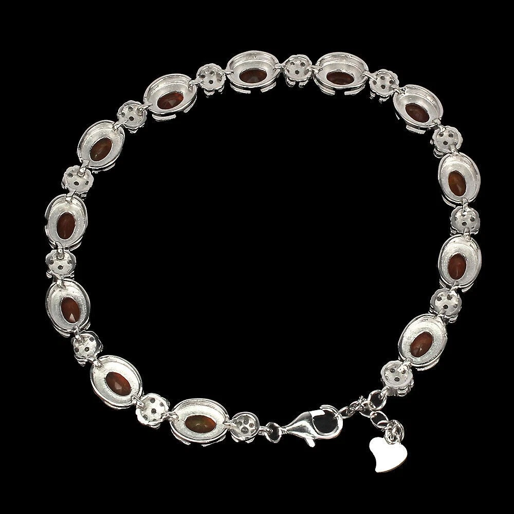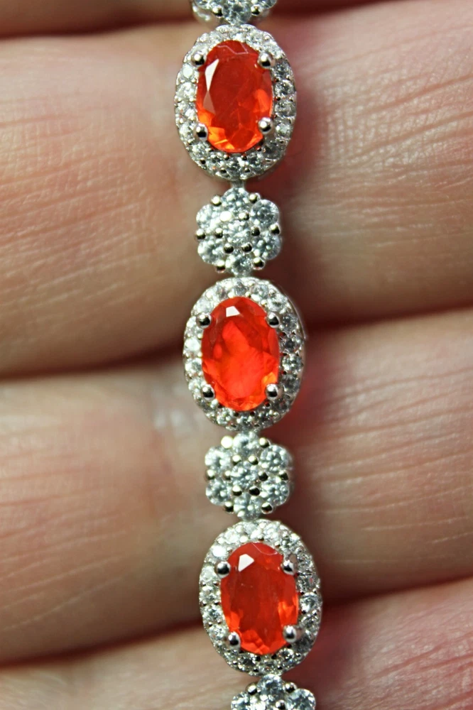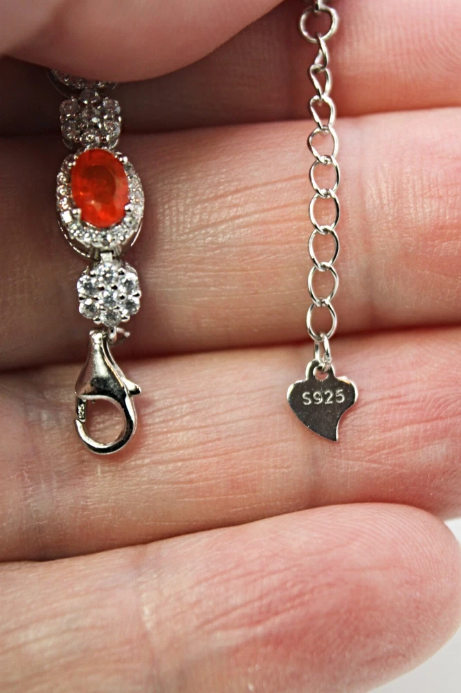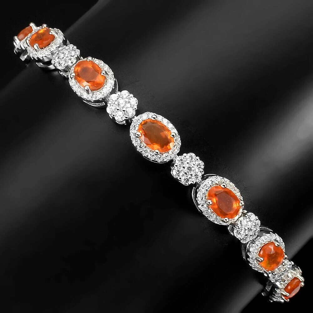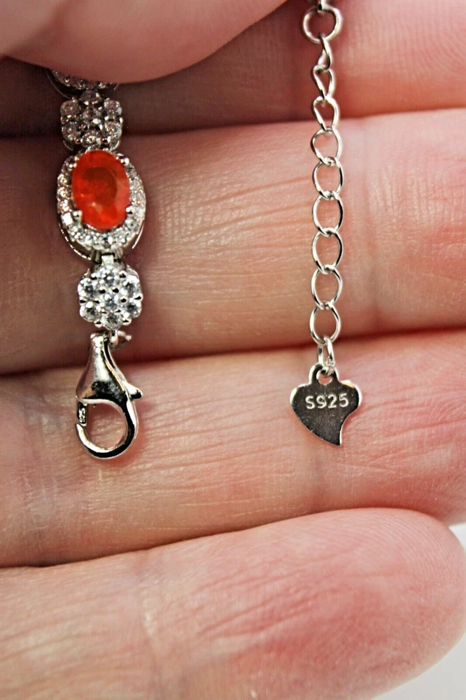 Solid sterling silver 925 stamped white gold coated bracelet featuring genuine natural mined oval cut faceted orange fire opal gemstones each measuring 6mm x 4mm each individaully set within a border of 1mm x 1mm bright white round cut faceted lab created zircon stones then set in an alternating design with a flower cluster of bright white round cut faceted lab created zircon stones each measuring 1.2mm x 1.2mm. The bracelet measures 17.7 to 20.3cm 7 to 8 inches using the integral extender chain. Total weight 13g / 7.8 carats GIFT BOXED Thanks for looking and please take time to view my other listings #17923