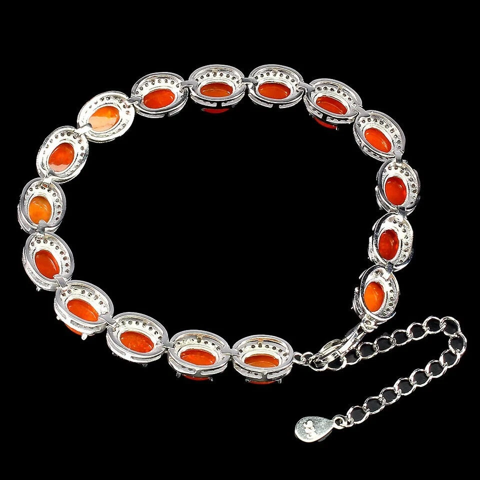 Solid sterling silver 925 stamped white gold coated bracelet featuring genuine natural mined oval cabochon orange fire opal gemstones each measuring 7mm x 5mm each individaully set within a border of 1mm x 1mm bright white round cut faceted lab created zircon stones. The bracelet measures 16.5 to 21.5cm 6 1/2 inches but can be fastened up to 8 1/2 inches using the integral extender chain. Total weight 14g / 9.48 carats GIFT BOXED Thanks for looking and please take time to view my other listings #18063