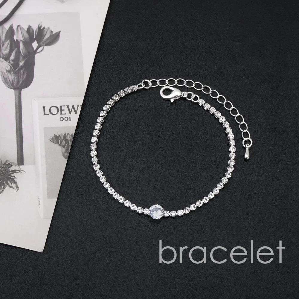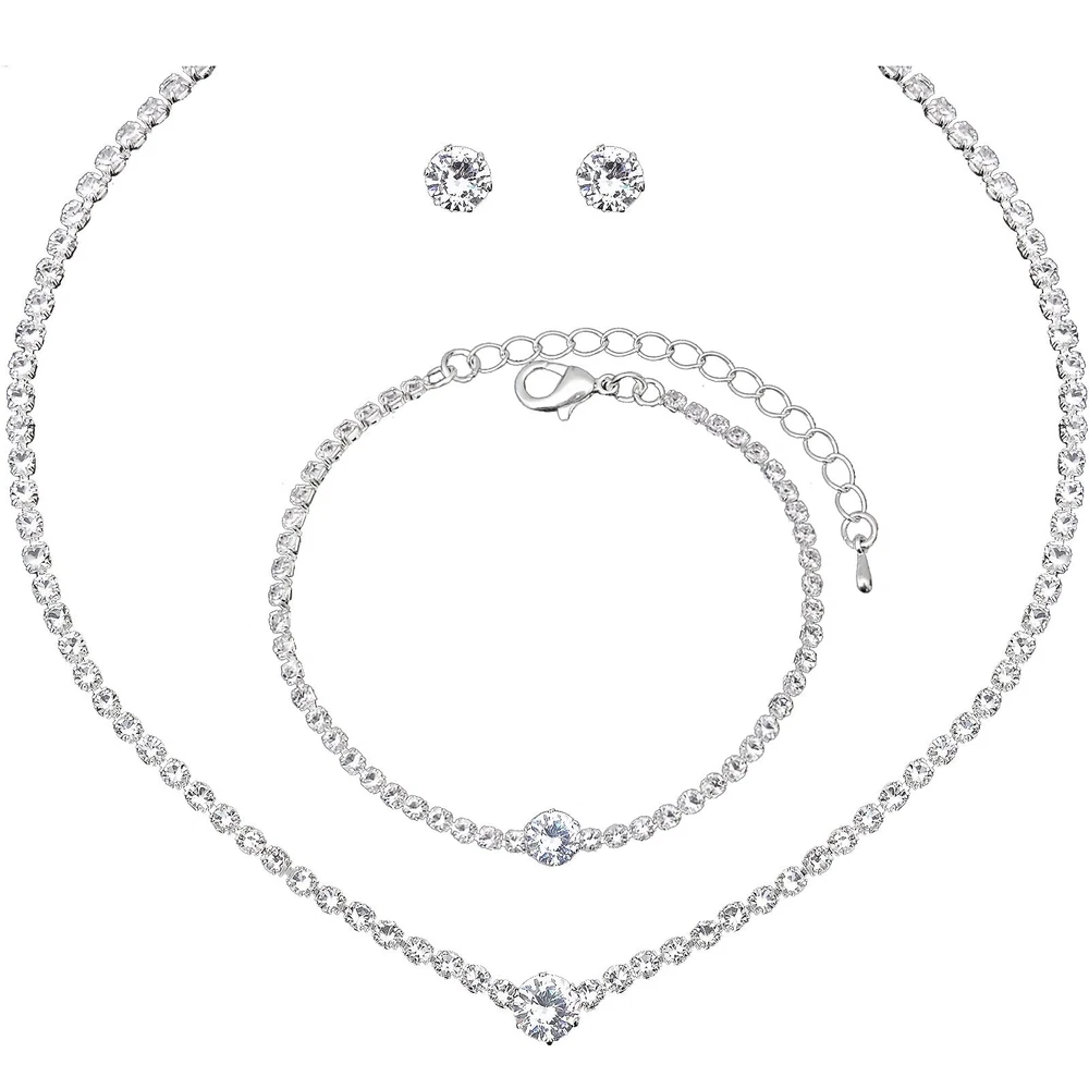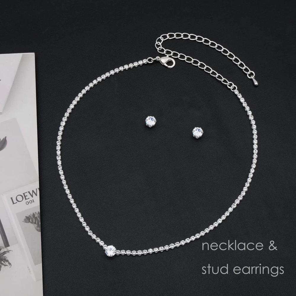 Silver Choker Necklace Earrings Tennis Bracelet Set Cubic Zirconia Crystal Wedding Jewelry Sets for Bride Bridesmaid Prom Formal Costume Accessories Product Details Package Dimensions : 4.25 x 3.15 x 1.22 inches; 1.45 ounces Department : womens Date First Available : August 29, 2023 Manufacturer : Floralseas Brand, Seller, or Collection Name: Floralseas Metal: silver plated brass Material: Silver Plated Brass Gem Type: Cubic Zirconia Setting: Prong Setting Clasp: Lobster Clasp The Floralseas Wedding Jewelry Set, ideal for bridesmaids or brides, boasts sparkling CZ stone, making it a timeless addition to any jewelry collection. This elegant set, comprising a necklace, earrings, and bracelet, can be paired with both classic casual and formal attire.