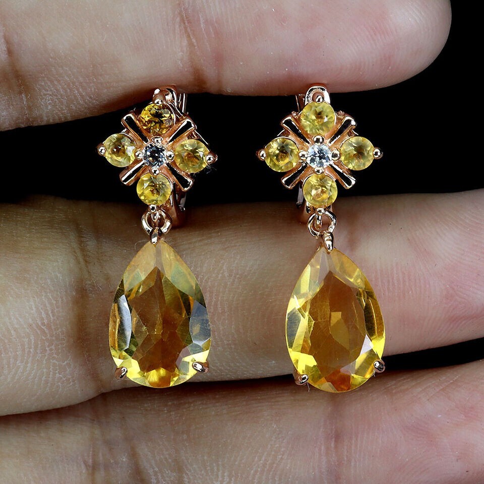 Solid sterling silver 925 stamped rose pink gold coated earrings featuring pear and round cut faceted genuine natural mined golden citrine gemstones each measuring from 3mm x 3mm to 12mm x 8mm set with bright white round cut faceted lab created stones each measuring 1.5mm x 1.5mm. The earrings measure 25mm x 10mm, have a leverback fastening and weigh 3g each. GIFT BOXED Thanks for looking and please take time to view my other listings #18081