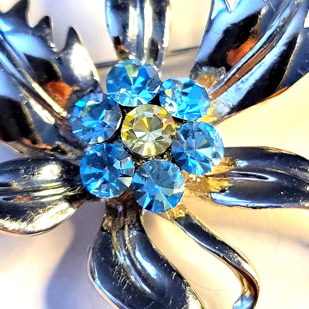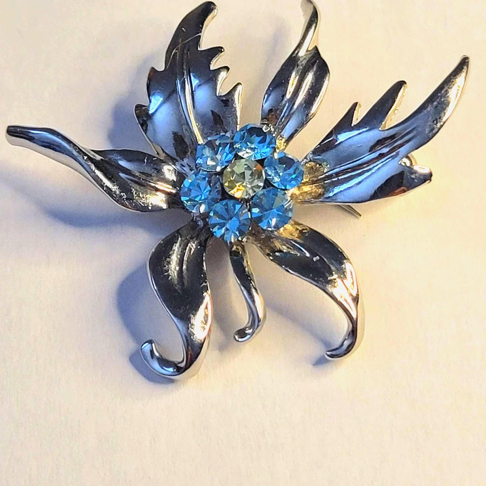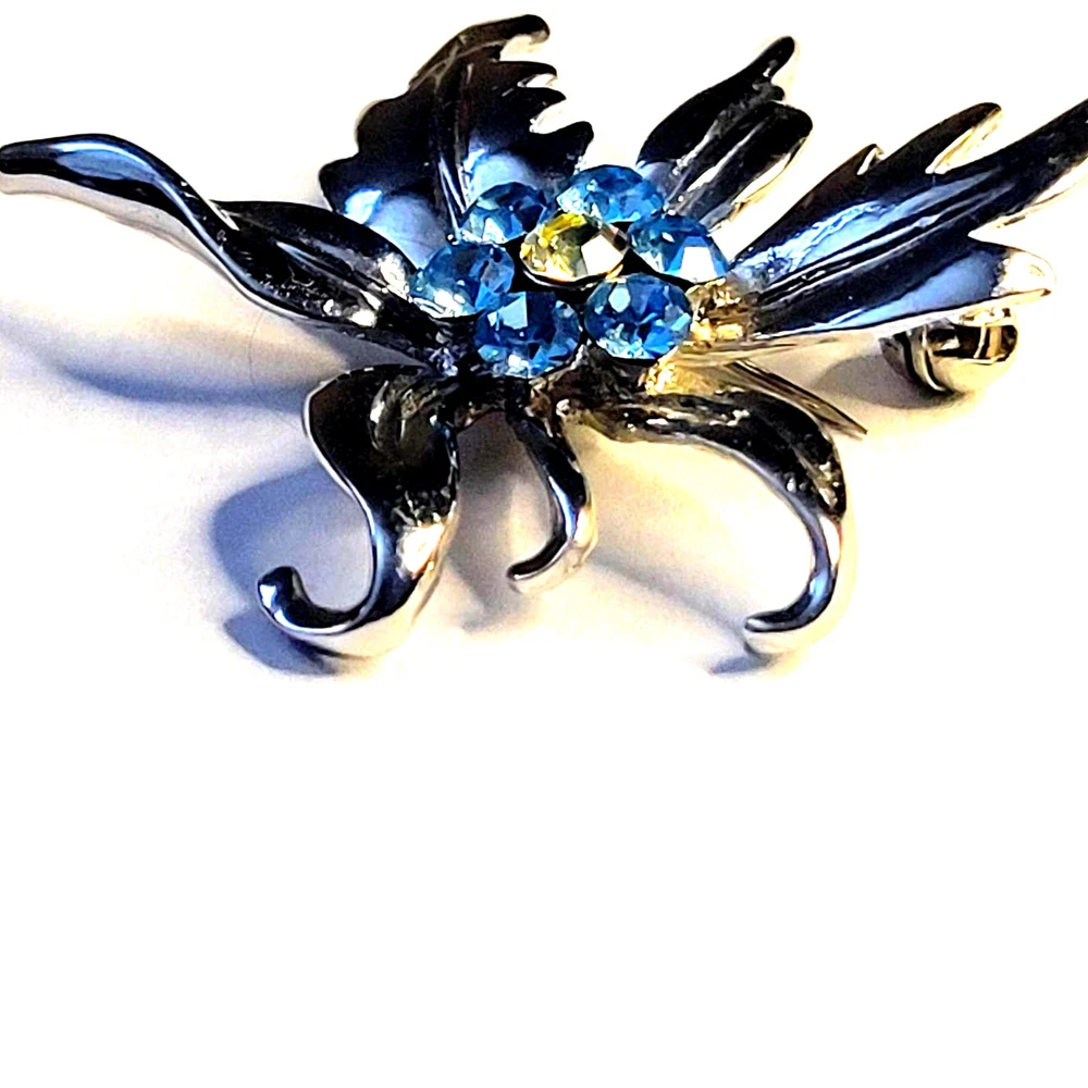 Absolutely Stunning Blue Floral Leaf Brooch Clear blue rhinestones in the middle of the pin. Silver Color Clear rhinestone in middle surrounded by blue rhinestone stones Broach is about 2 inches long It's about 1 3/4 inch wide Please check out the Photos The brooch is in excellent condition and has been gently worn. As a pre-owned item there may be a slight amount of wear. They are stored in a smoke-free area.