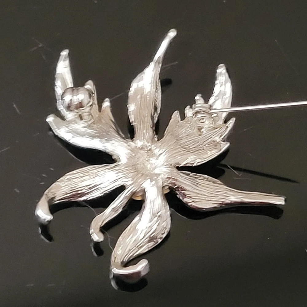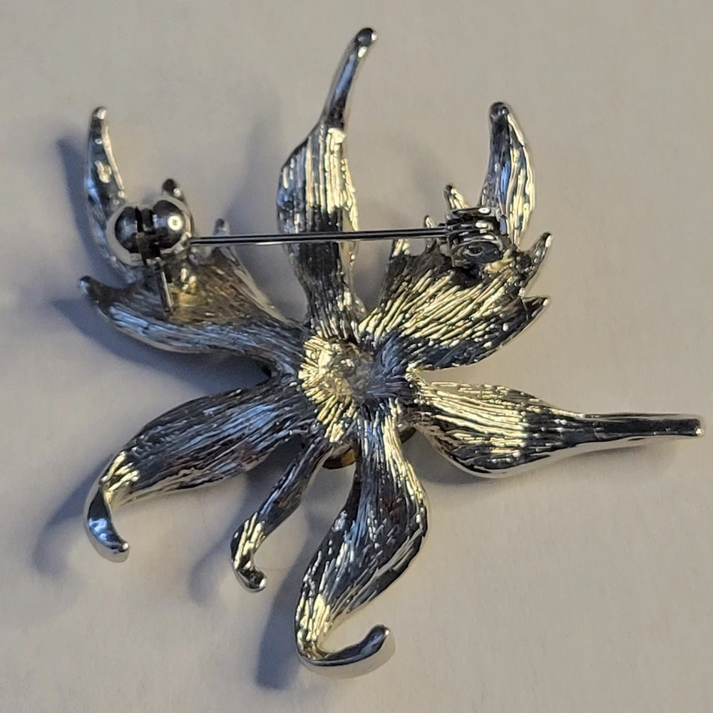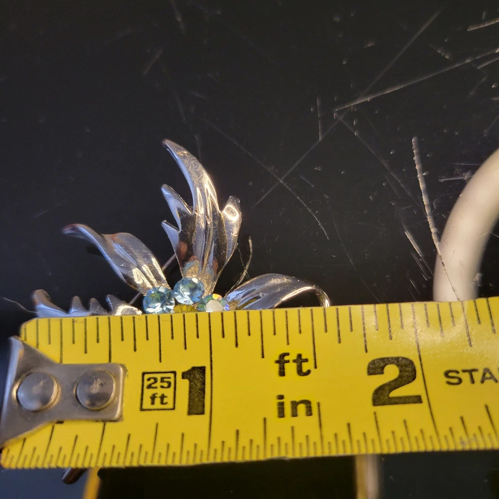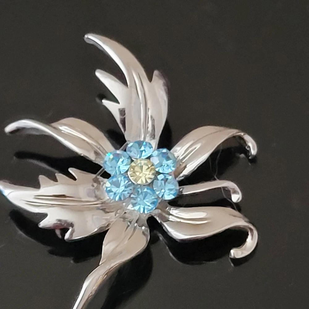 Absolutely Stunning Blue Floral Leaf Brooch Clear blue rhinestones in the middle of the pin. Silver Color Clear rhinestone in middle surrounded by blue rhinestone stones Broach is about 2 inches long It's about 1 3/4 inch wide Please check out the Photos The brooch is in excellent condition and has been gently worn. As a pre-owned item there may be a slight amount of wear. They are stored in a smoke-free area.
