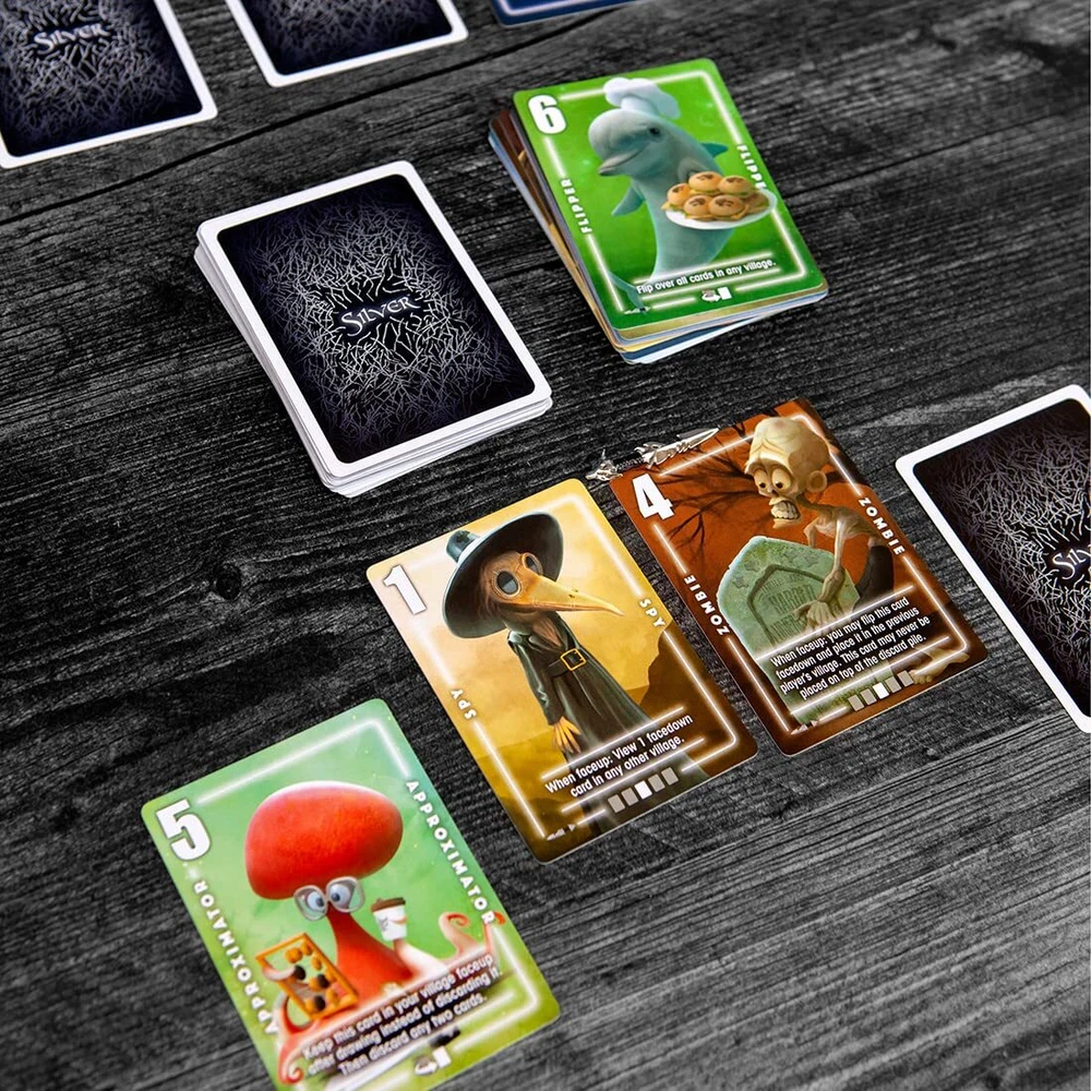 Introducing Silver Dagger: the thrilling fourth installment in the Silver Series! Immerse yourself in these quick and engaging card games with an exciting twist of memory and werewolves! Silver Dagger brings you 14 fresh roles and abilities that will inject strategic twists into your gameplay. Keep an eye on the #4 Zombie cards, which present a particular challenge by making it tricky to get rid of them. Zombies can't be placed atop the discard pile, and they must be faceup to pass them to the previous player. But fear not, helpful roles like the Debt Collector, deducting points from your opponents based on their card count, and the game-changing Halfling, with the power to halve your entire score, offer strategic advantages. Just like in other Silver games, your goal is to for a vote when you believe you possess the fewest werewolves lurking in your village. But beware! Your opponents have last chance to save themselves or disrupt your plans. Elevate your gaming experience with Silver Dagger, a perfect addition to the Silver Series! Easy to learn, quick game play and perfect for families! Must have for card game fans, complete with strategy, memory elements, and twists! Strategic gameplay through unique abilities and acquire the Silver Dagger secret for success Thrilling werewolf hunt in a fast, and fun card game! Mix and Match for fun replayability! Discover the versatility of the Silver series by combining games.