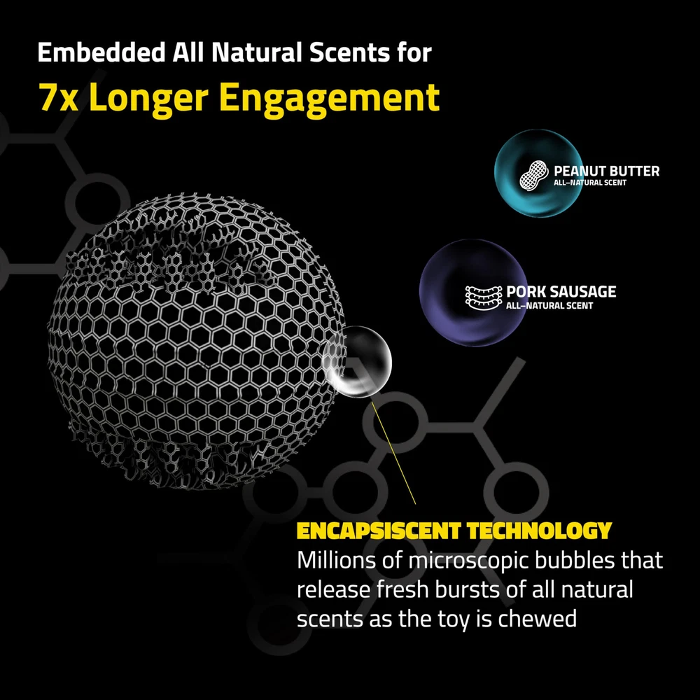 MEET THE SENIOR DENTAL CHEW BALL: Made with a soft rubber material designed for aging teeth and gums, and embedded with all-natural Peanut Butter scent, this is the toy your senior pup has been waiting for. This interactive chew toy is designed with deep grooves to help clean your pup's teeth and gums while they play and chew. The Jumbo size is ideal for dogs 50 lbs and up. ENCAPSISCENT TECHNOLOGY: A dog’s sense of smell is 10,000x more powerful than a human’s. Dogs experience the world through scent, so we make interactive dog toys with the all-natural scents they love. Every dog toy is embedded with an all-natural scent at the microscopic level. The fresh bursts of scent that are released with each chew will keep your pup engaged 7x longer than unscented toys. EASY TO CLEAN: Dirt and sand trapped on the surface of a toy can grind down your pup’s teeth, that's why we make all our rubber dog toys easy to clean. With our Encapsiscent Technology, the all-natural scent is embedded throughout the material of each toy, so no need to worry about washing away the scent your pup loves. Just rinse with warm water to clean and pat dry. FOUNDED BY DOG LOVERS: When we developed , we looked at the science behind what made dogs enjoy their toys. We reviewed the safety standards used to protect human children and designed our dog toys utilizing those standards. Each toy is tested to meet ASTM guidelines for safety and the CPSIA standards for leads, phthalates, and other toxins deemed hazardous. Everyone at remains committed to designing and developing the best, safest and healthiest toys we possibly can HAPPINESS : At , we're more than just toys; we're about making tails wag and ending the toy graveyard blues. So, if you encounter any issues or if your furry friend isn't overjoyed with our products for any reason, we're here to save the day. Your dog's happiness is our !