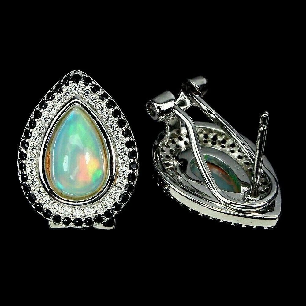 Solid sterling silver 925 stamped white gold coated stud earrings featuring a central pear cabochon genuine natural mined white opal gemstone with rainbow colours measuring 9 mm x 6mm surrounded by a row of 1mm x 1mm bright white round cut faceted lab created zircon stones which are then surrounded by a row of 1mm x 1mm genuine natural mined black spinel gemstones each measuring 1mm x1mm. The earrings measure 16mm x 12mm and have an english lock fastening. GIFT BOXED Thanks for looking and please take time to view my other listings #16216 / 16217