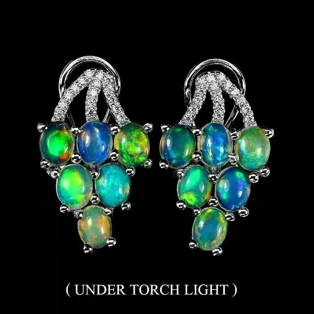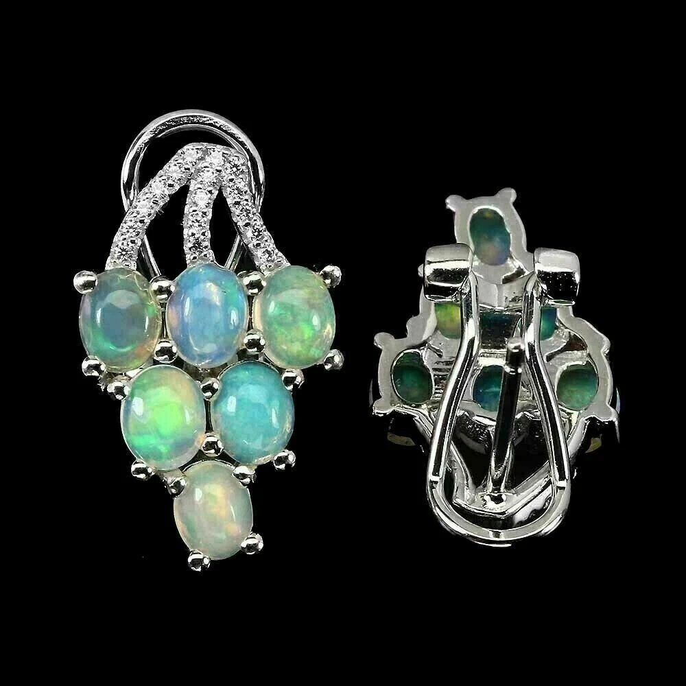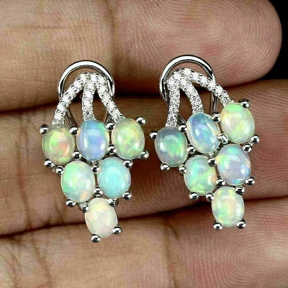 Solid sterling silver 925 stamped white gold coated earrings featuring genuine natural mined white opal oval cabochon gemstones each measuring 5mm x 4mm which have a rainbow of colour set with bright white round cut faceted lab created zircon stones each measuring 1mm x 1mm. The earrings measure 22mm x 12mm and they have an English lock fastening. GIFT BOXED Thanks for looking and please take time to view my other listings #15921