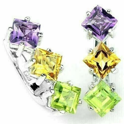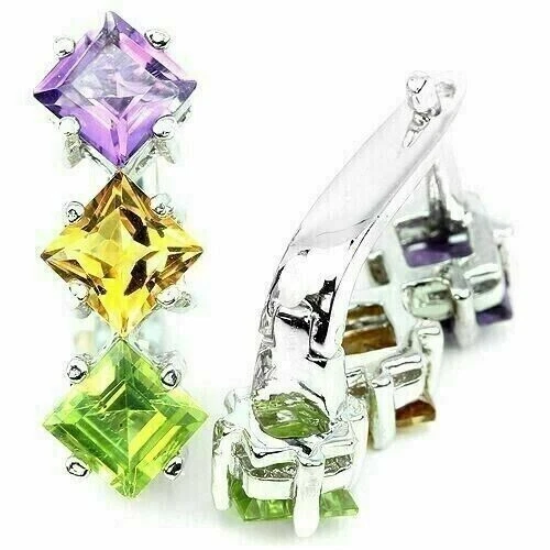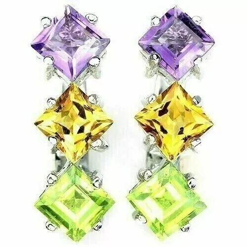 Solid sterling silver 925 stamped white gold coated earrings featuring square cut faceted genuine natural mined purple amethyst, genuine natural mined golden yellow citrine and genuine natural mined green peridot gemstones each measuring 7mm x 7mm set into a stick design. The earrings measure 21mm x 7mm and have a leverback fastening. GIFT BOXED Thanks for looking and please take time to view my other listings #7317/7321