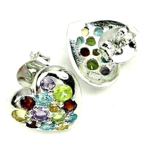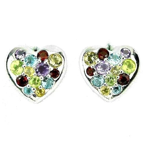 Solid sterling silver 925 stamped white gold coated heart shaped stud earrings featuring round cut faceted genuine natural mined gemstones - purple amethyst, yellow citrine, apple green peridot, red garnet and heated blue topaz gemstones - each measuring 2mm x 2mm and 3mm x 3mm set within the heart shaped design . The earrings measure 13mm x 12mm and have a post and butterfly fastening. GIFT BOXED Thanks for looking and please take time to view my other listings #6772