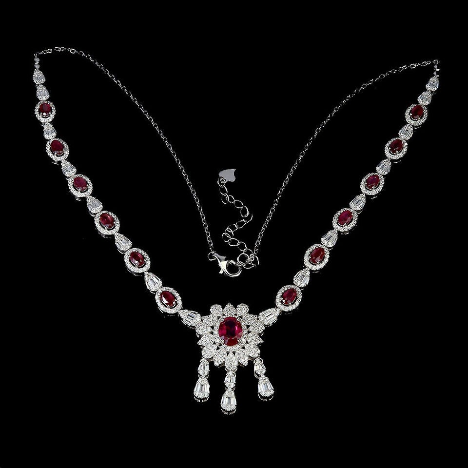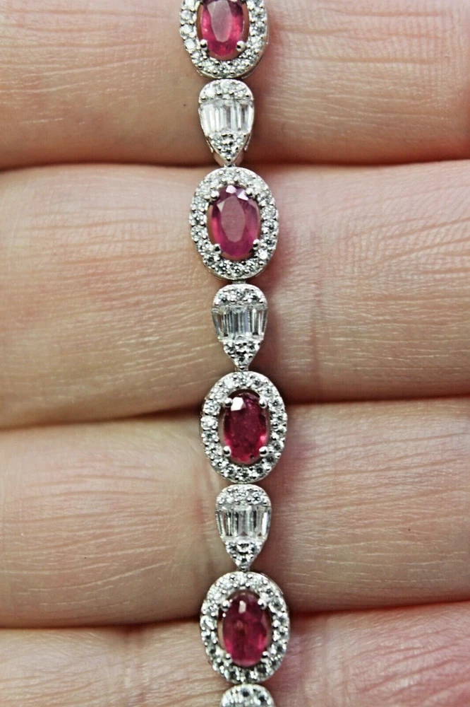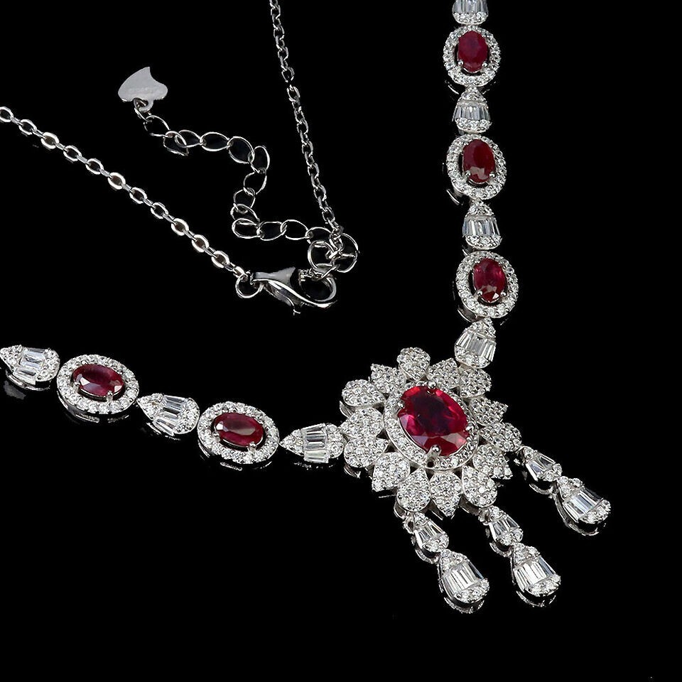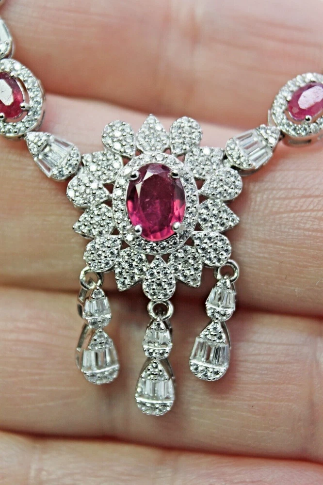 Solid sterling silver 925 stamped white gold coated necklace in a stylish design featuring oval cut faceted genuine natural mined heated pink ruby gemstones each measuring from 5mm x 3mm to 8mm x 6mm set with bright white round and taper baguette cut faceted lab created zircon stones each measuring from 1mm x 1mm to 3mm x 2mm. The necklace can be fastened anywhere between 17 and 19 inches using the integral extender fastening and t he stone set part measures 220mm x 30mm. GIFT BOXED Thanks for looking and please take time to view my other listings #18125