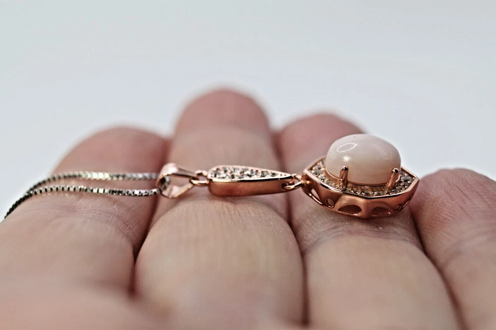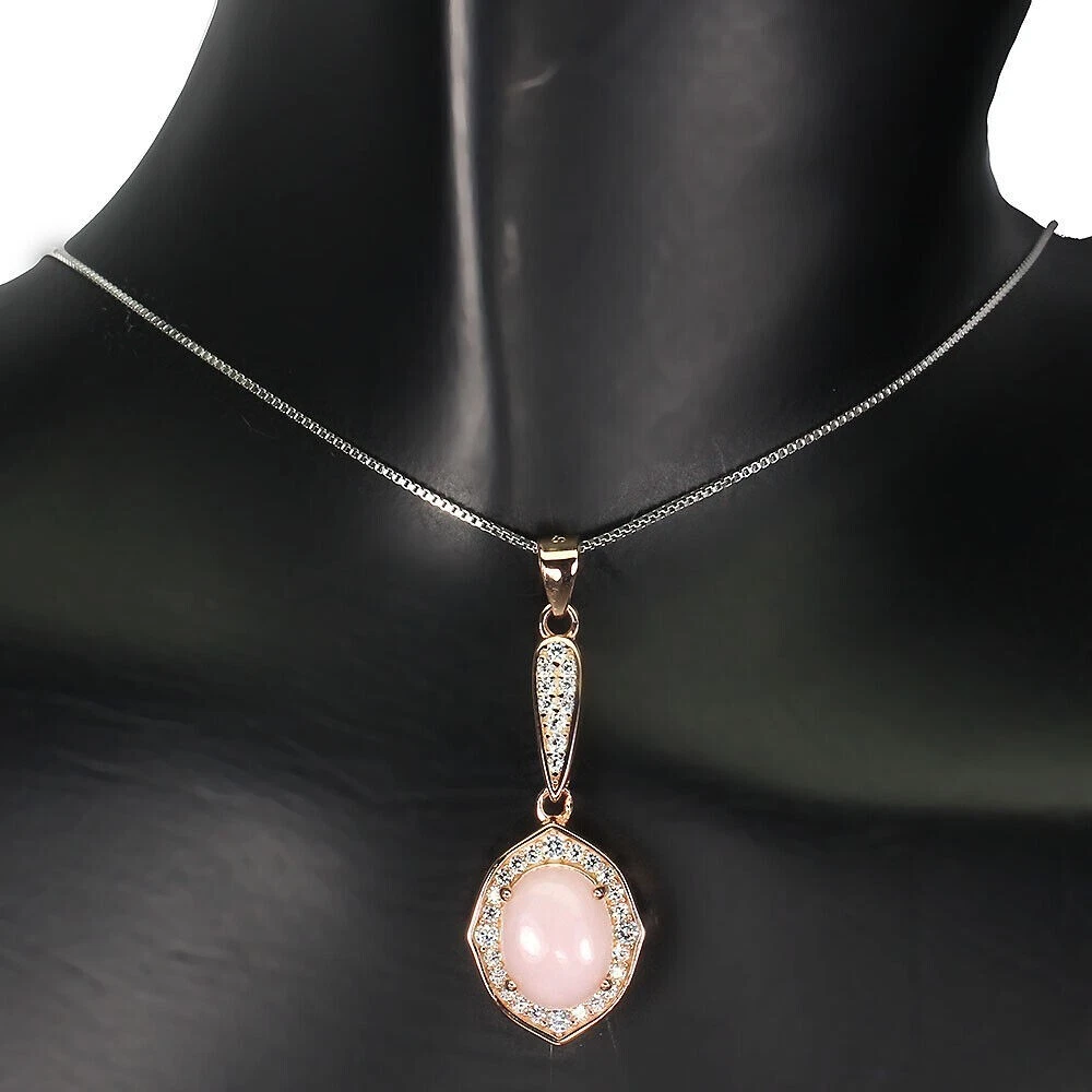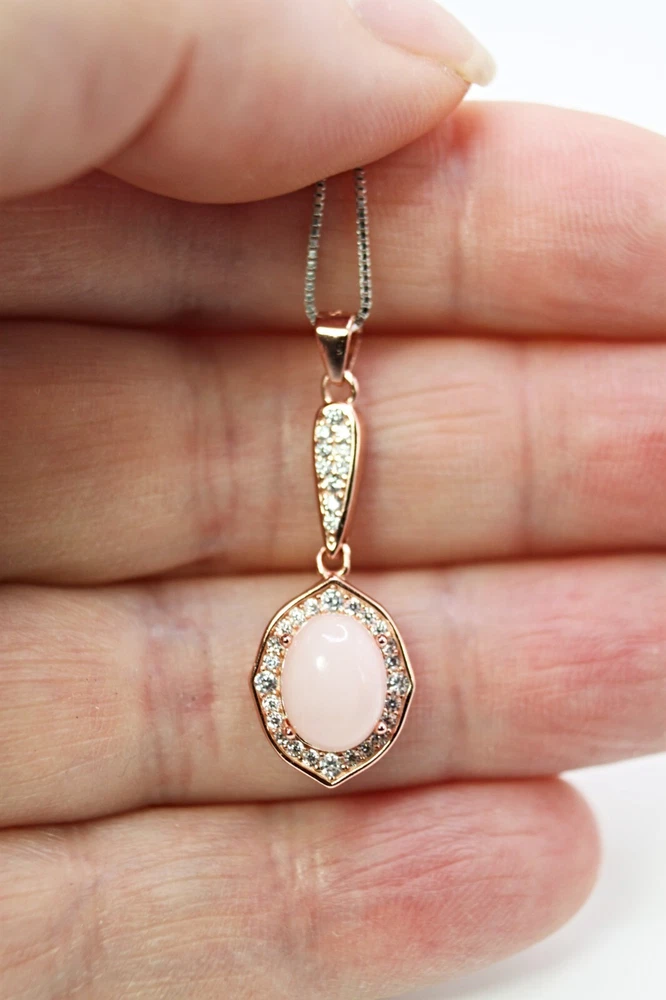 Solid sterling silver 925 stamped rose pink gold coated pendant featuring a genuine natural mined oval cut faceted pink opal gemstone measuring 9mm x 7mm set within a border of 1mm x 1mm bright white round cut faceted lab created zircon stones which continue along the bale measuring up to 1.5mm x 1.5mm. The pendant measures 33mm x 11mm including bale and comes complete with a free matching 45.7cm 18 inch rose pink gold coated chain. GIFT BOXED Thanks for looking and please take time to view my other listings #17615