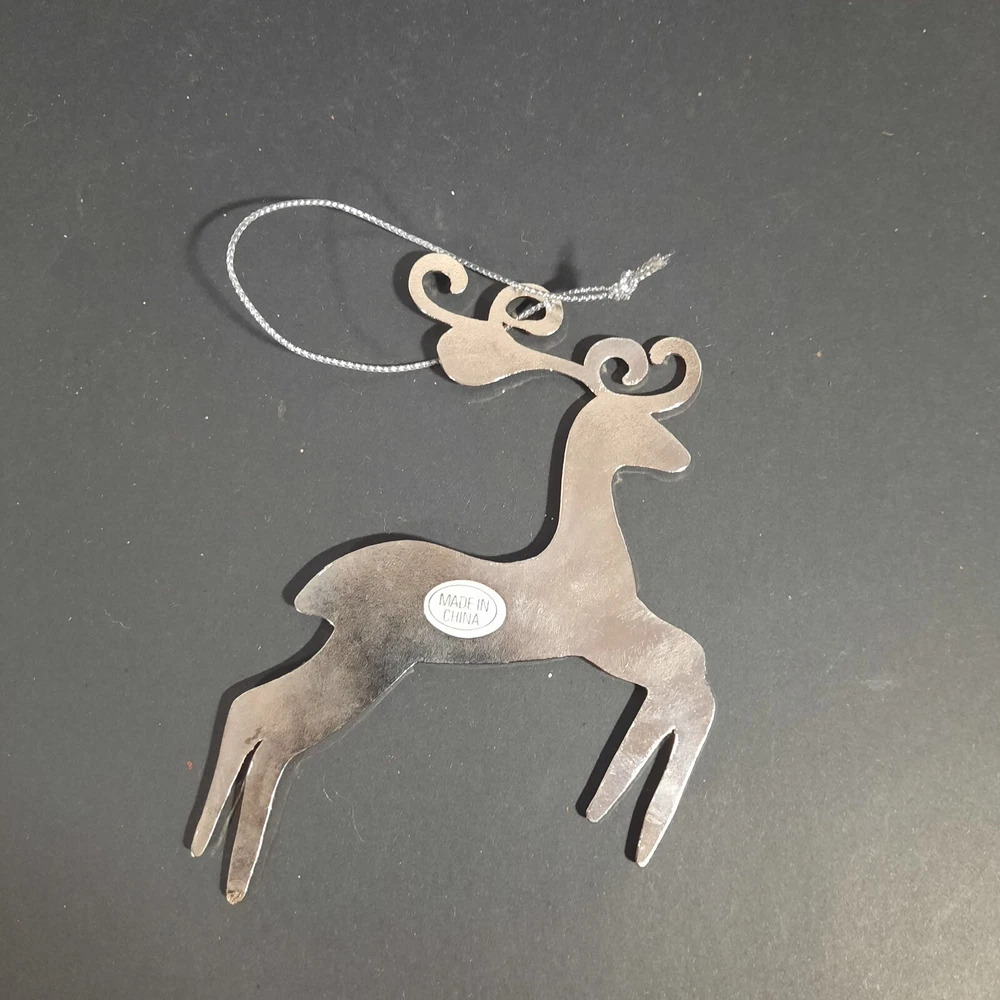 This reindeer ornament is a sophisticated addition to holiday decor. Featuring a sleek silver outline with pink enamel detailing, it provides an elegant touch to any Christmas tree. • Silver outline with pink enamel detailing • Hanging string included • Made in China