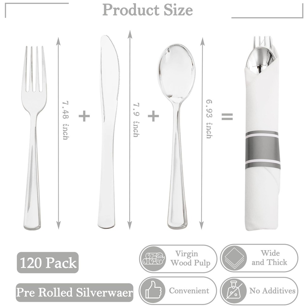 Description 120Pack Silver Plastic Silverware 【Super Pack】These silver plastic silverware includes 120 silver plastic forks, 120 silver plastic spoons, and 120 silver plastic knives, 120 white napkins. Whether it's a birthday party or a wedding, the wrapped plastic cutlery set with napkin is everything you need for a perfect mealtime experience. The silver silverware disposable will totally make your guests happy at the party! 【Strong and Durable】This rolled plastic silverware is crafted of food grade materials. The silver plastic forks and spoons are not easy to break or bend during use, allowing you and your guests to cut through even tough and dense food with confidence. Pre rolled napkins with plastic cutlery set can make it easy to clean the corners of your mouth during and after meals. 【Reasons for Popularity】Our silver disposable dinnerware set can be used for wedding / Birthday party, rehearsal dinners, graduation ceremonies, anniversaries, birthday parties, Christmas, Thanksgiving and other parties. This silver disposable cutlery is exquisitely designed and will definitely make your party more colorful. 【Food Safe】The pre wrapped silverware and napkin is made of food-safe plastic that is non-toxic and BPA-free, are safe to come in with any food. The smooth edges and high quality texture provide a comfortable dining experience. The silver plastic silverware is safe. 【Diversity of Choices】Our pre rolled napkins with plastic cutlery set are available in a wide range of quantities at the store. We've got everything you need to satisfy your cravings for convenience. Pro tip: The rolled silverware disposable, making cleanup a breeze after throwing a big party. Lighting - brightening up your life!