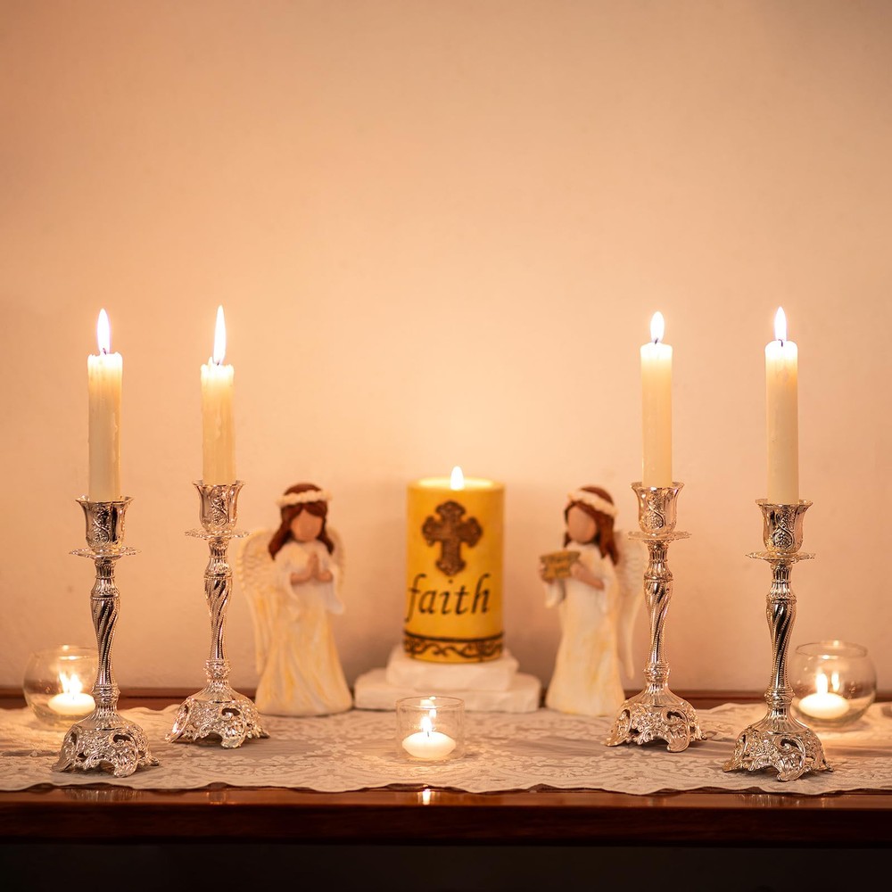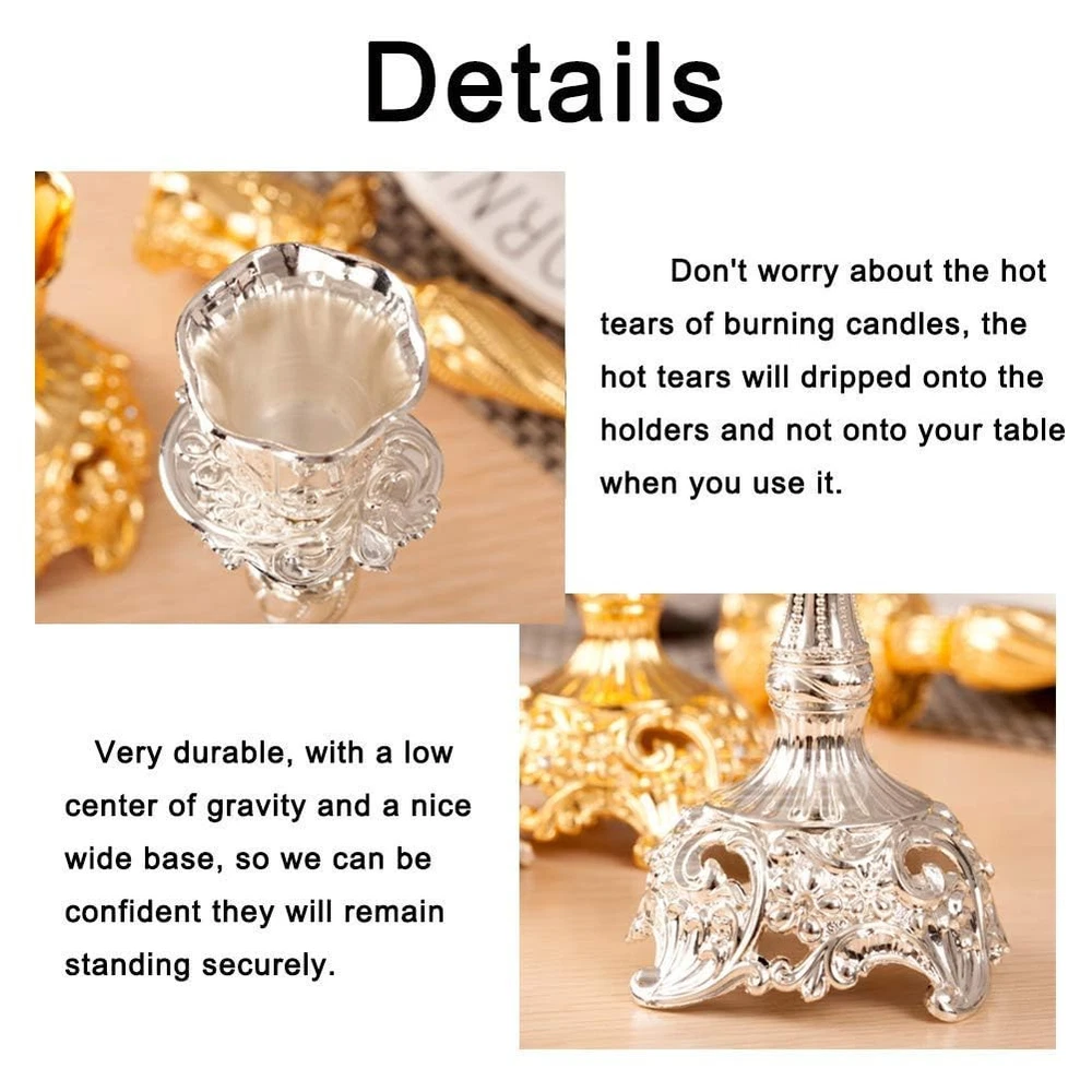 Are you looking for a intricate engravings candlestick for you special events? Our silver plated candlesticks Holders suits the color scheme of nearly any setting. They are perfect for the Shabbat or holiday table when you do not want to use your ornate antiques. Material: metal Color: silver Size: Height: Small: 10cm/3.9” Large: 18.8cm/7.4” Base wide: 7.6cm/3” Package List: 2 × Size L metal candlesticks holder NOTE: If the holders are much wider than the candles you bought, you can melt the bottom of the candles in order for them to stand up straight, or you can wrapped the candle base in a little aluminum foil and they will be fine. has a wide selection of wedding/party and home decorative items, especially focusing on decorative candle holders, hanging glass bulbs, toasting champagne glass for wedding ceremony or anniversary keepsake, and metal vase for flower arrangement for wedding/party centerpiece. Here you can find various decorative styles of candle holders, such as farmhouse, organic, casual, rustic, Scandinavian, modern styles and so on. ELEGANTLY DESIGN: These sterling silver plated candle sticks feature flowers, swirls, and textured designs carved with discerning detail. The top opening and base piece are shaped like flowers. Plain candles will appear elegant in these ornate holders. STABLE & DURABLE: Our taper candle holders is very durable, with a low center of gravity and a nice wide base, so it is can be confident they will remain standing securely. CONSIDERATE DESIGN: The candle holders made of metal, don't worry about the hot tears of burning candles, in addition, the hot tears will dripped onto the holders and not onto your table when you used it. APPLICATION: Our silver plated candlesticks holders fit seamlessly into any occasion, whether a wedding, party, celebration, a candlelit romantic dinner at home or a restaurant. And the ornate design of these candlesticks is also suitable for religious rituals and ceremonies, such as lighting Shabbat candles, as well as for party and special occasion decoration.