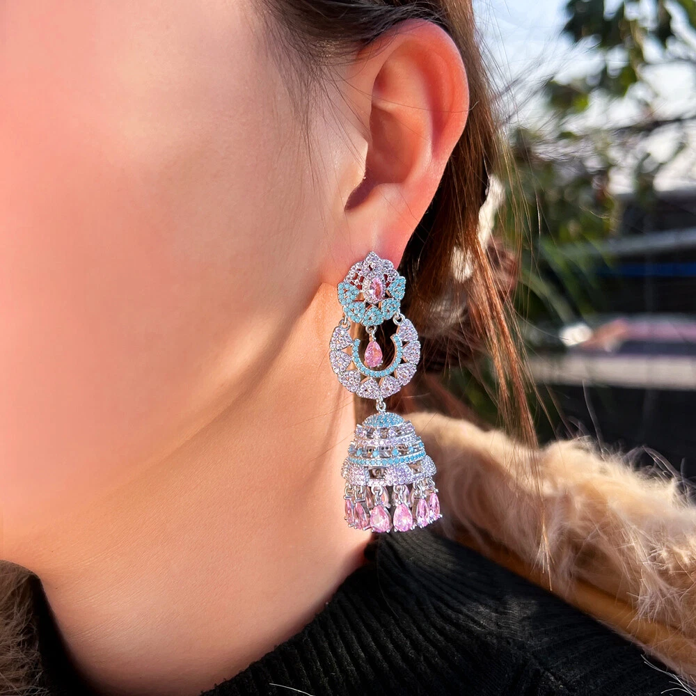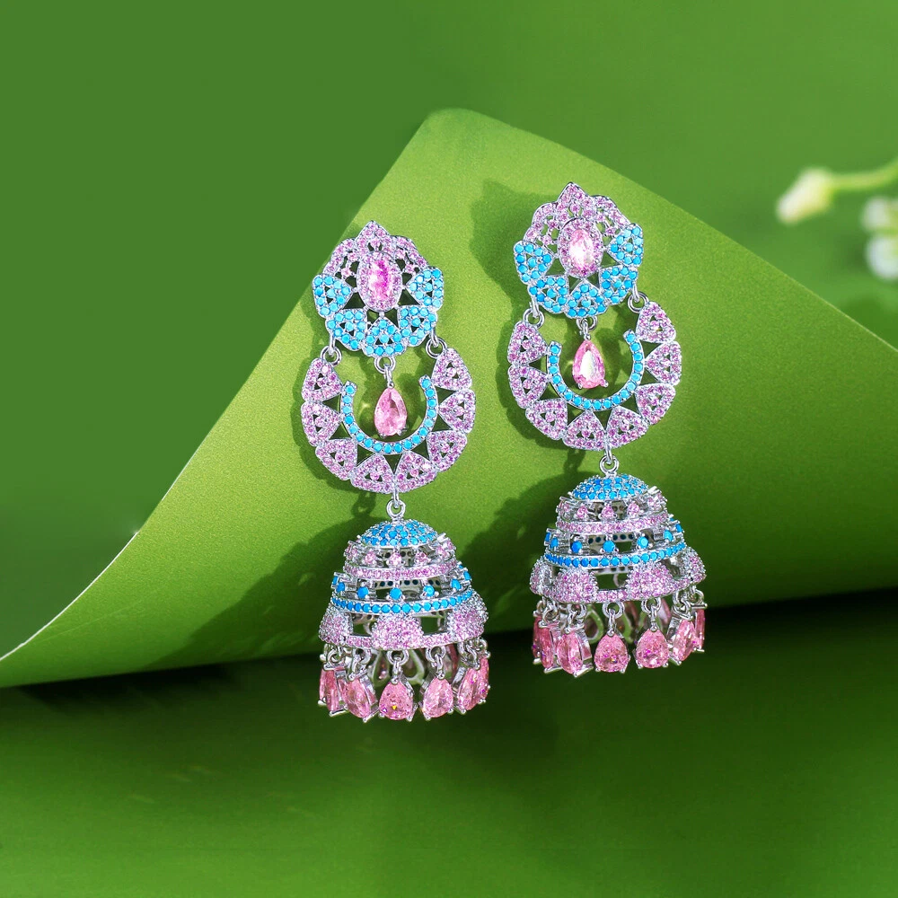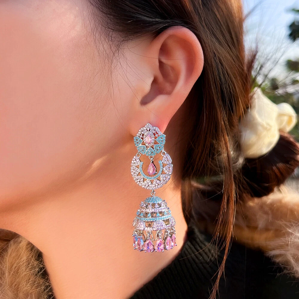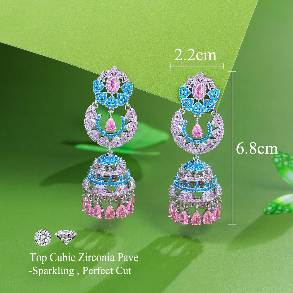 Silver Plated Cubic Zirconia Long Pink Turquoise Chandelier Drop Dangle Earrings