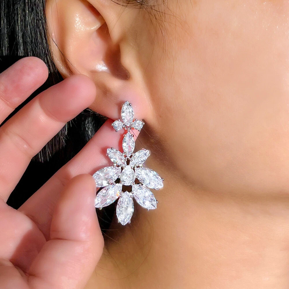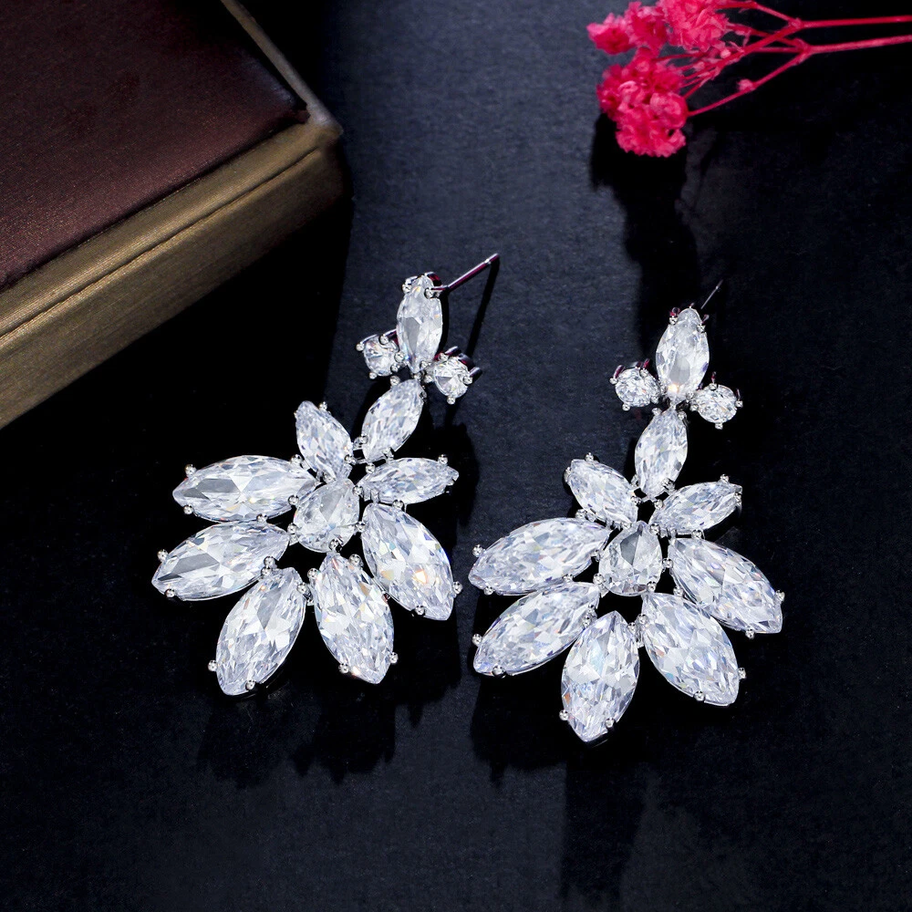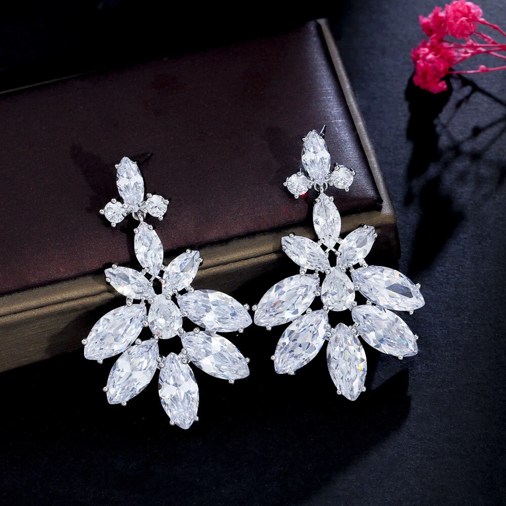 Silver Plated Sparkling Zircon Crystal Leaf Long Dangle Drop CZ Wedding Earrings