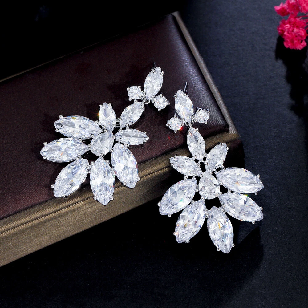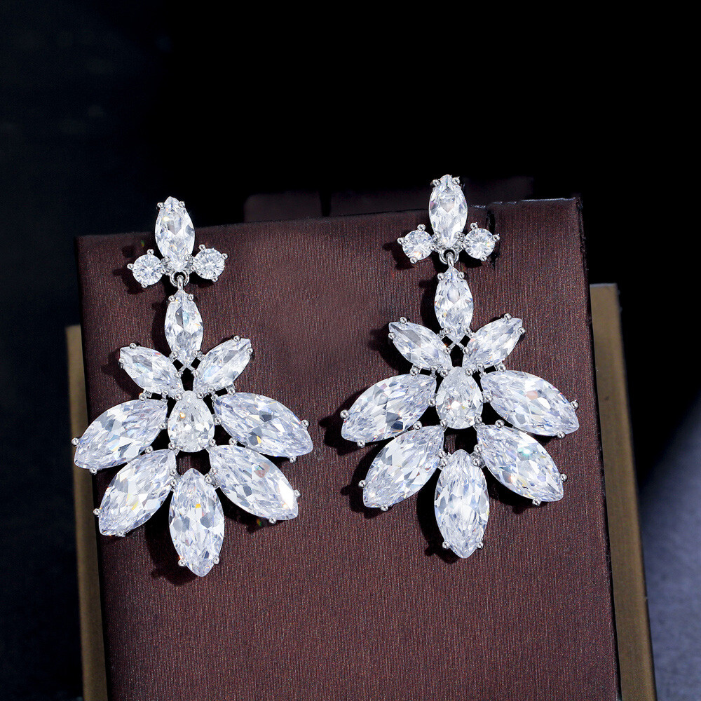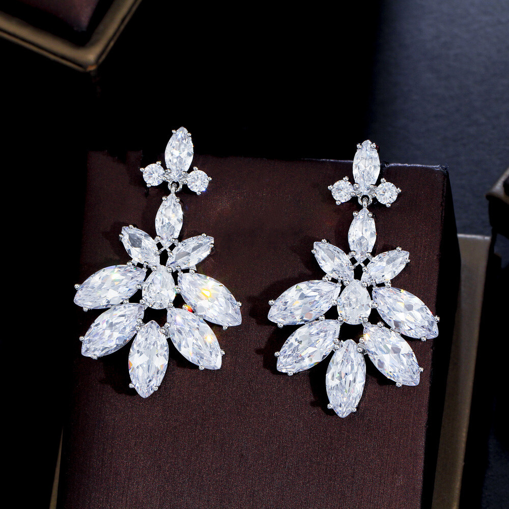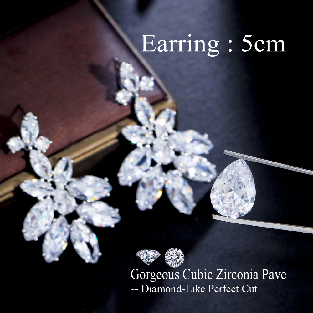Silver Plated Sparkling Zircon Crystal Leaf Long Dangle Drop CZ Wedding Earrings