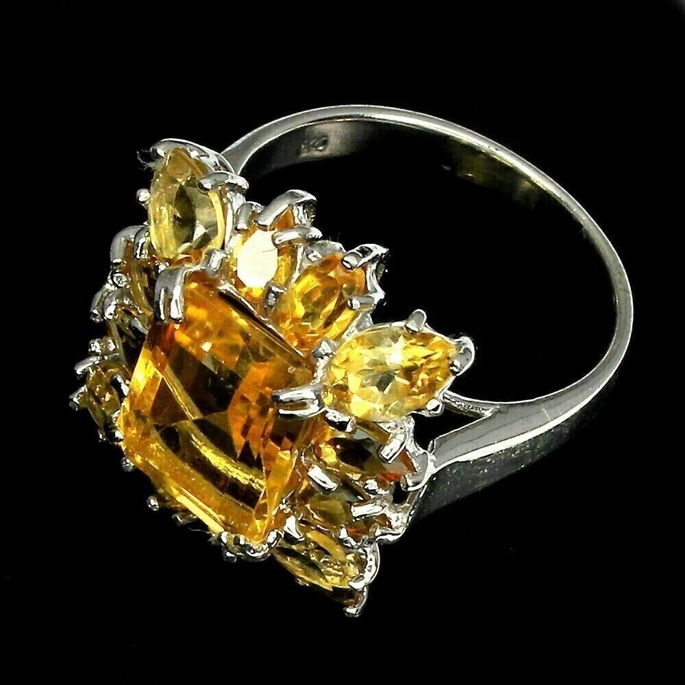 Solid sterling silver 925 stamped white gold coated ring which features octagon and pear cut faceted genuine natural mined golden citrine gemstones each measuring from 5mm x 3mm to 11mm x 9mm set into a cluster design. The ring measures 21mm x 19 m m and it is a size R 1/2 (US 9). GIFT BOXED Thanks for looking and please take time to view my other listings #11211